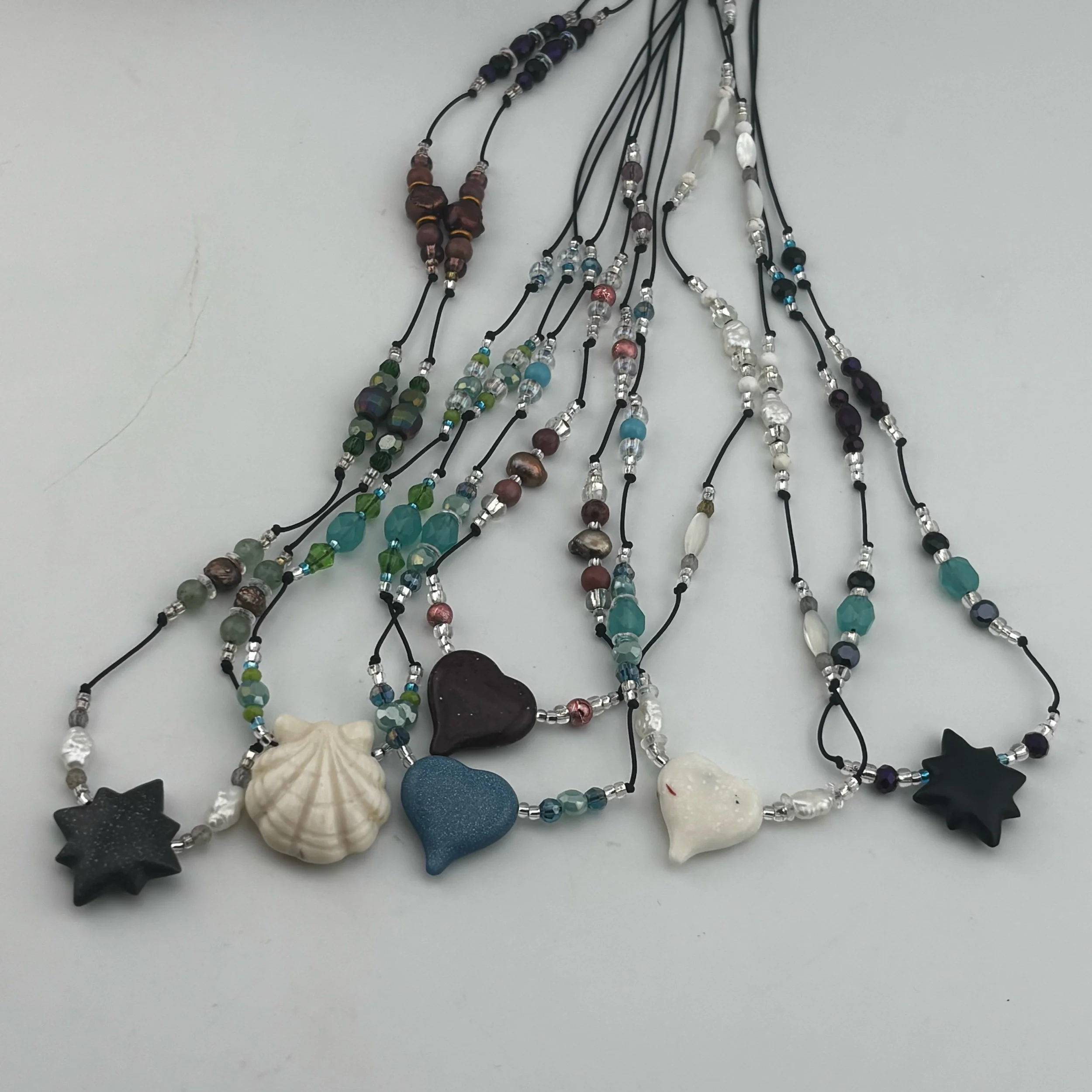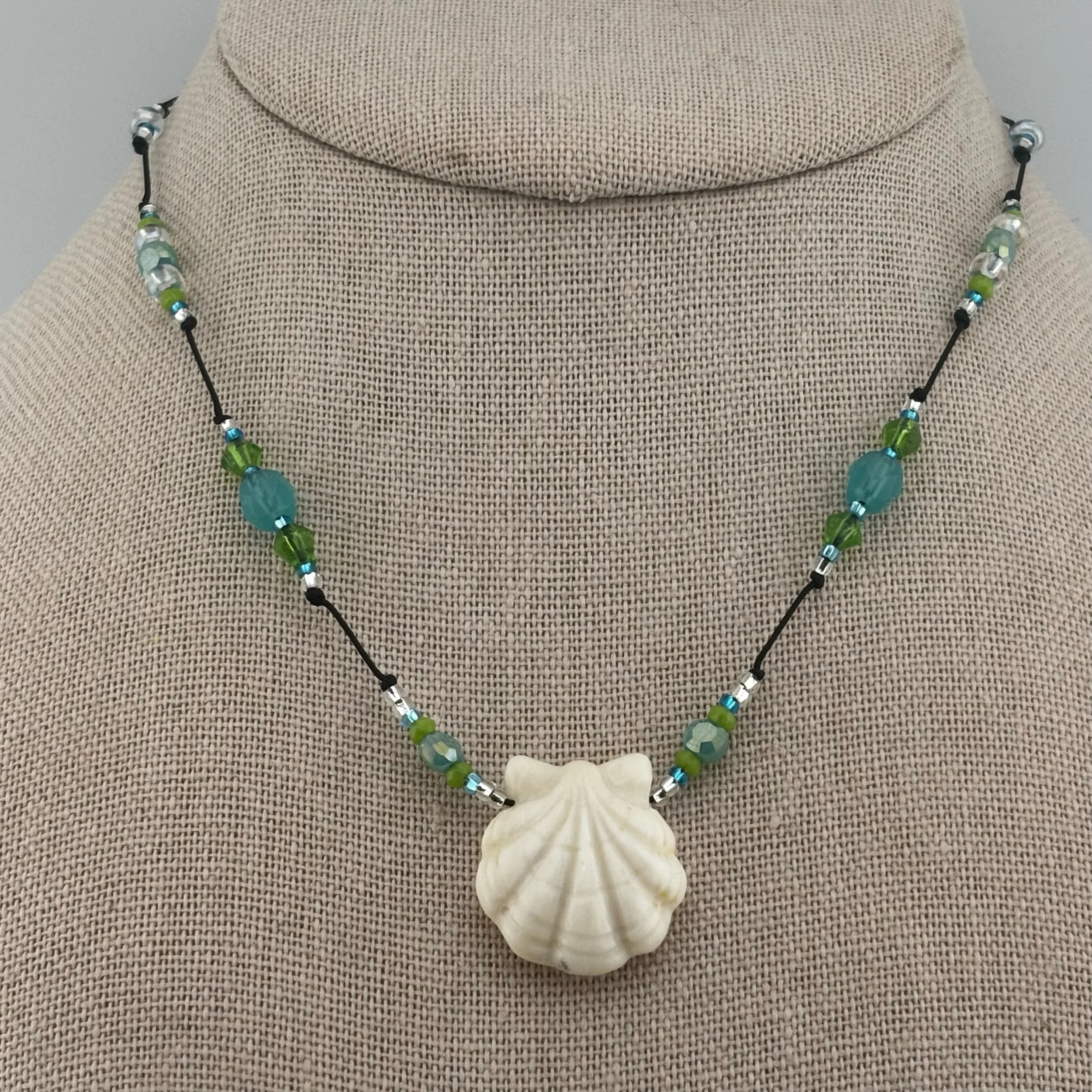 • SeaGreen (bone): Bone Scallop hand carved by Christopher Miller, lightly beaded by Heidi B with Faceted, Molded, and Silver-lined Glass on braided nylon cord with screw-type barrel clasp. 25” or shorter, please specify length in transaction notes.
