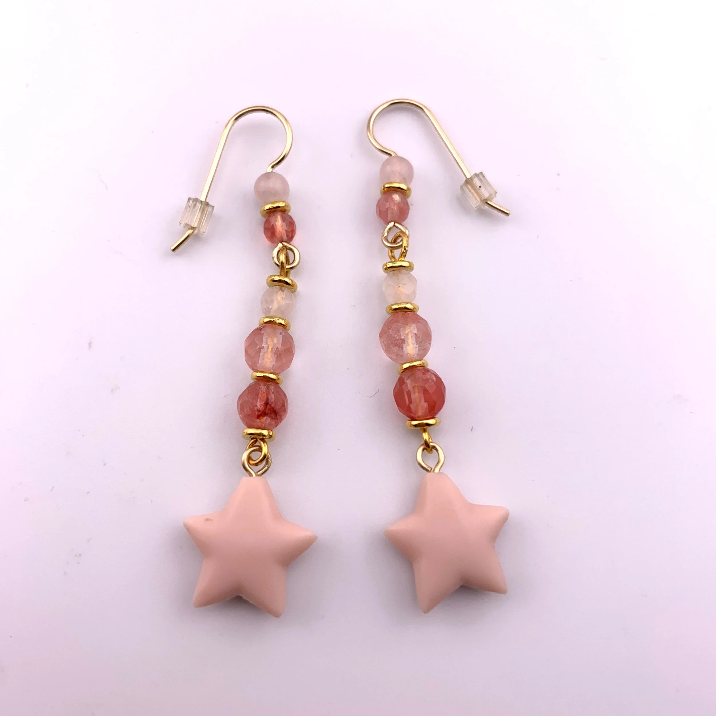 Handcarved Corian Stars by Christopher Miller. Beaded Earrings by Marni Zimlin with Rose quartz, Faceted Rhodachrosite, Faceted rose quartz.