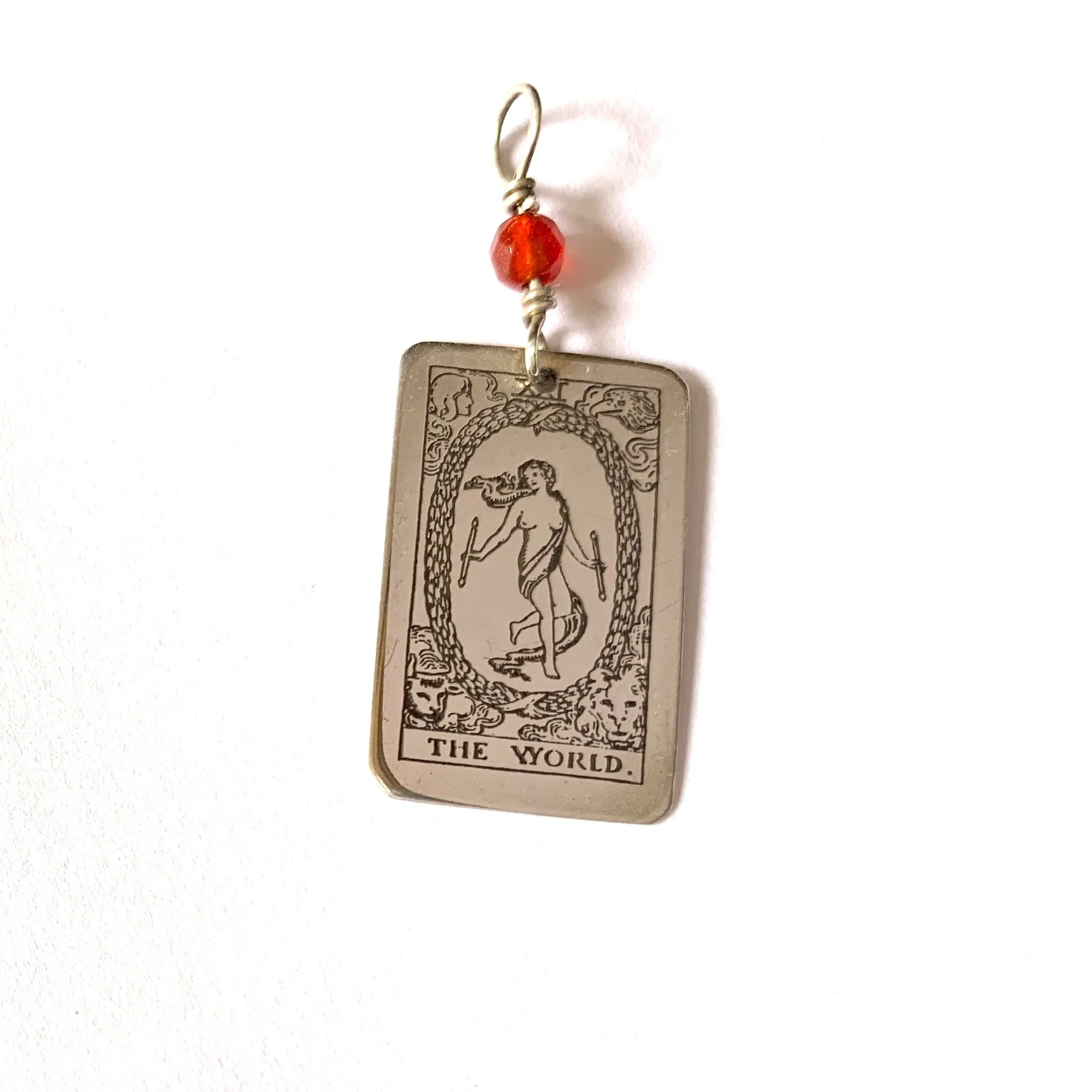 Tiny Tarot World charm for your own chain. Faceted Carnelian bead on wire wrap. Etched by Gino Schiavone, wrapped by the late Judith Schiavone. Silver Card 1” high X 5/8” wide, wrapped wire + card = 1.5” total.
