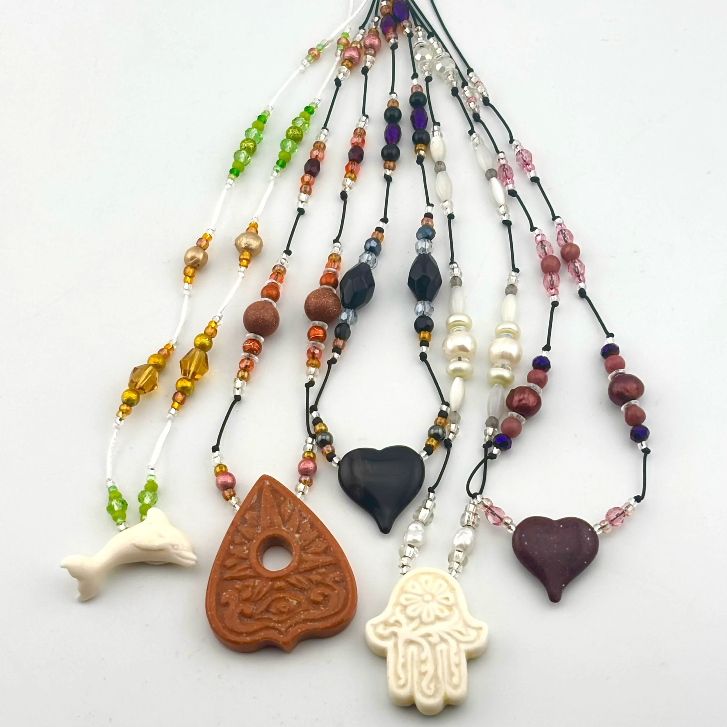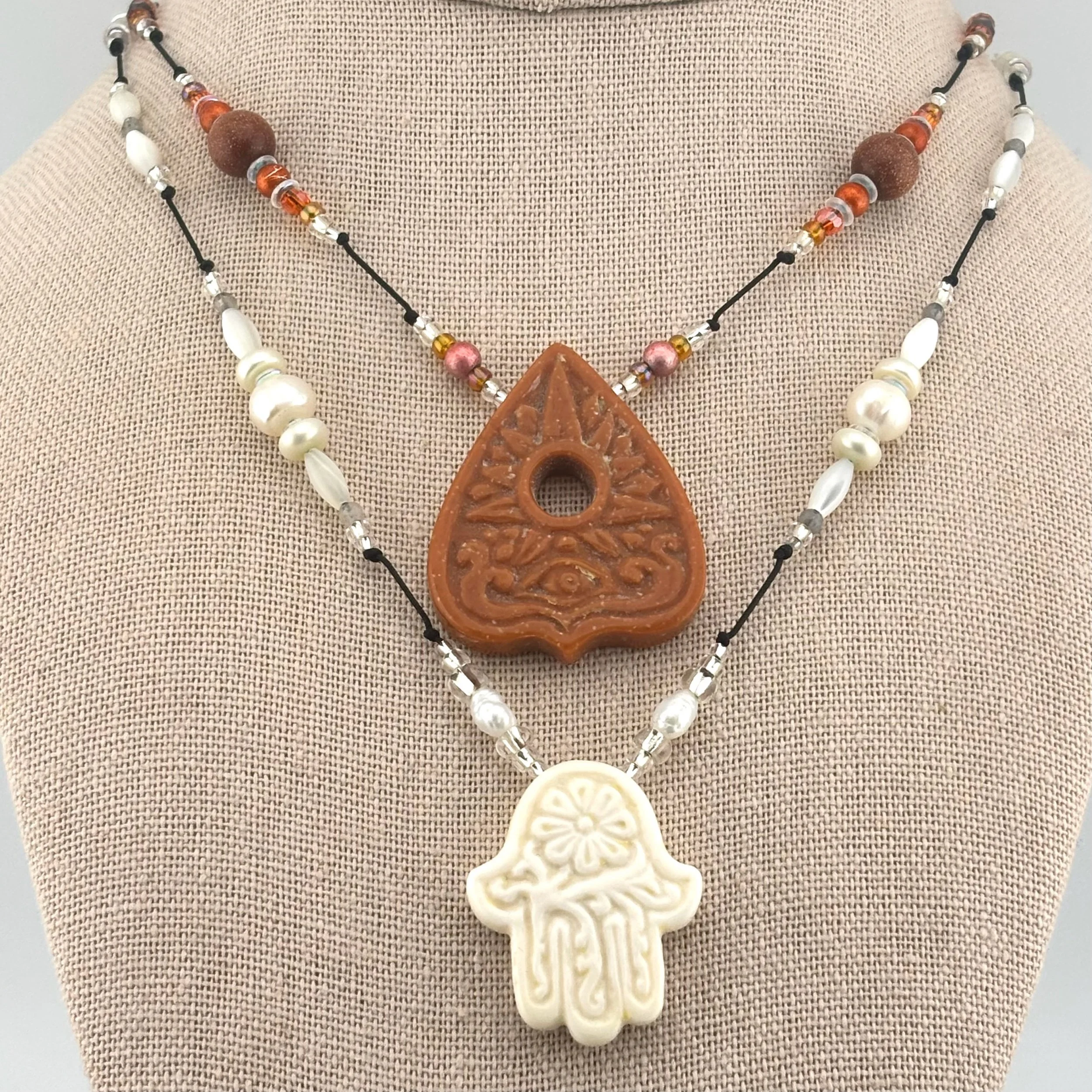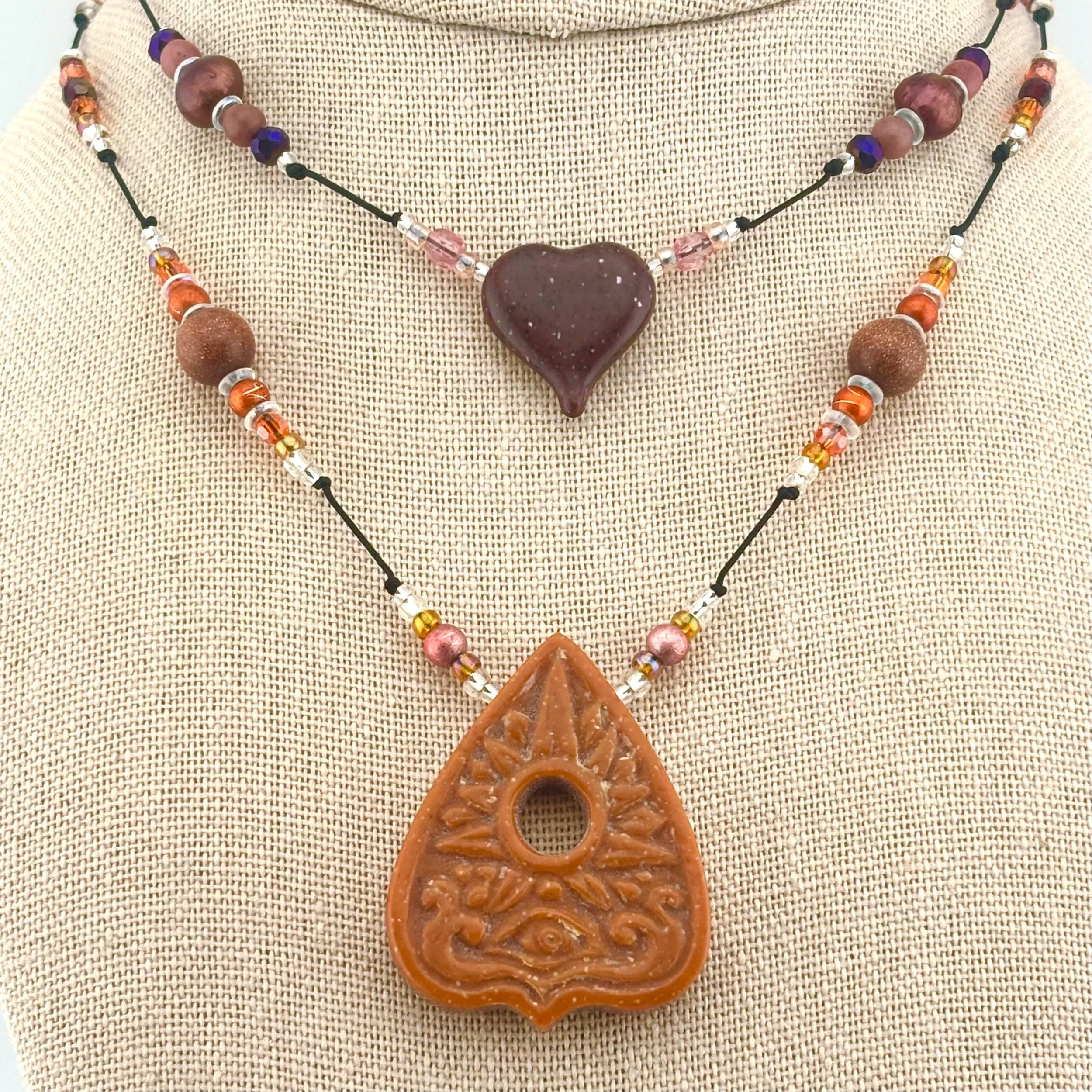 •Curious Traveler: Adobe Corian Planchette hand carved by Christopher Miller, lightly beaded by Heidi B with GoldStone, Faceted, Enameled & Molded Glass, & Silver-lined seed beads on braided nylon cord with screw-type barrel clasp.