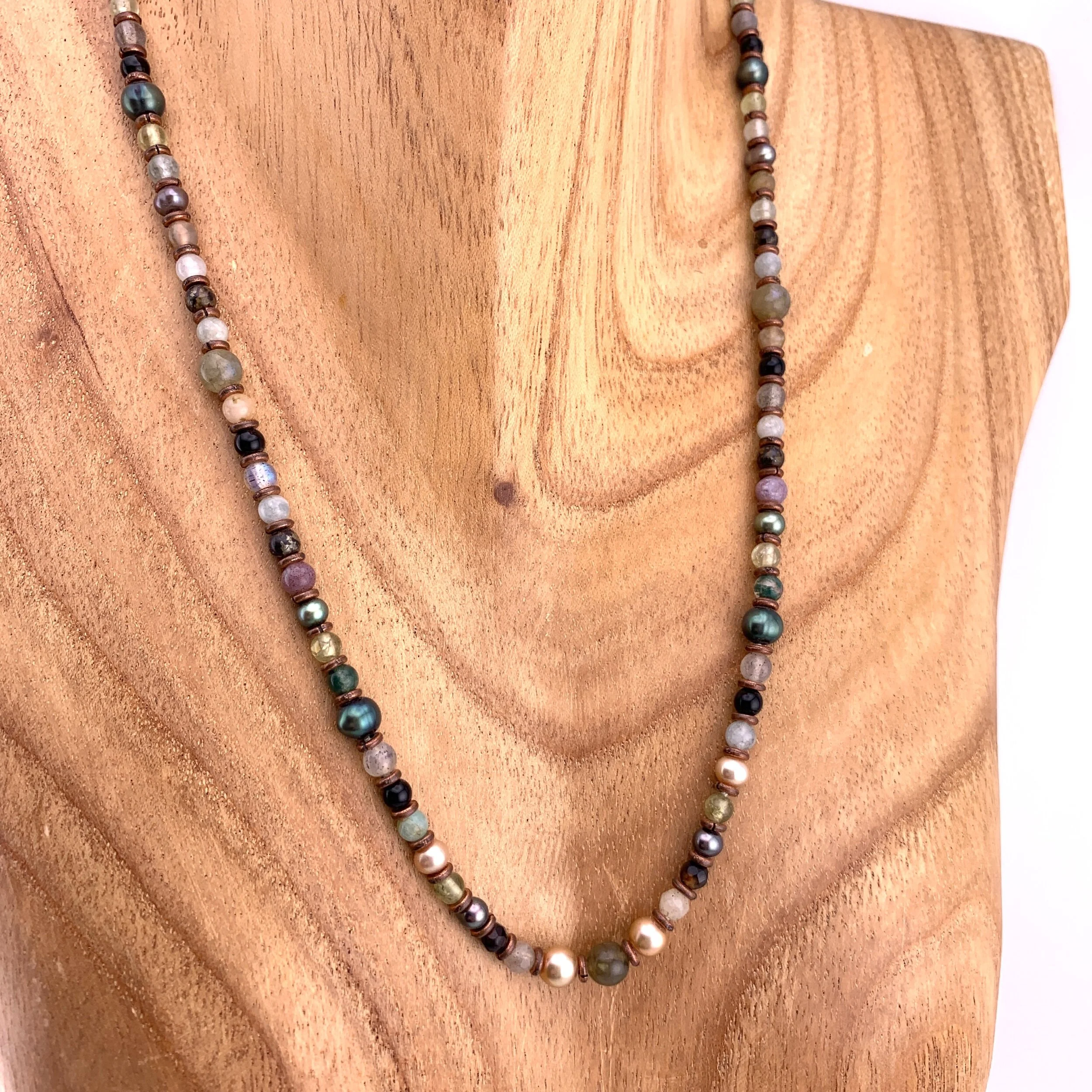 Copper spacers. Hand knotted on silk, 20”