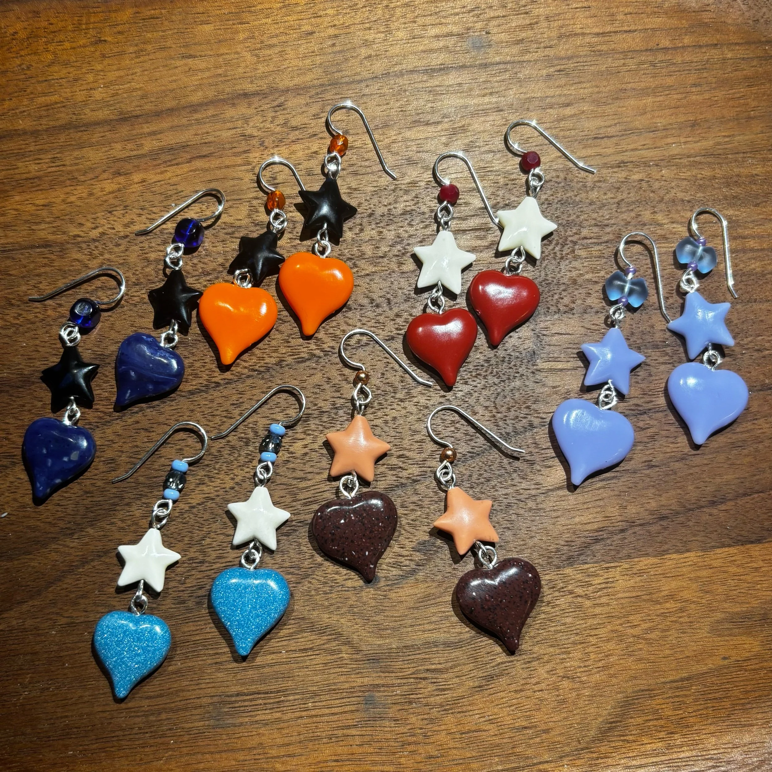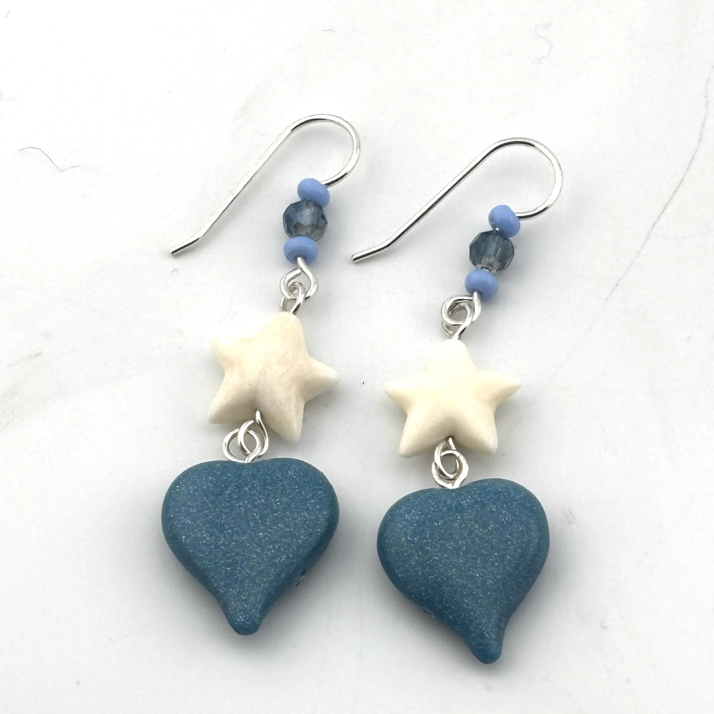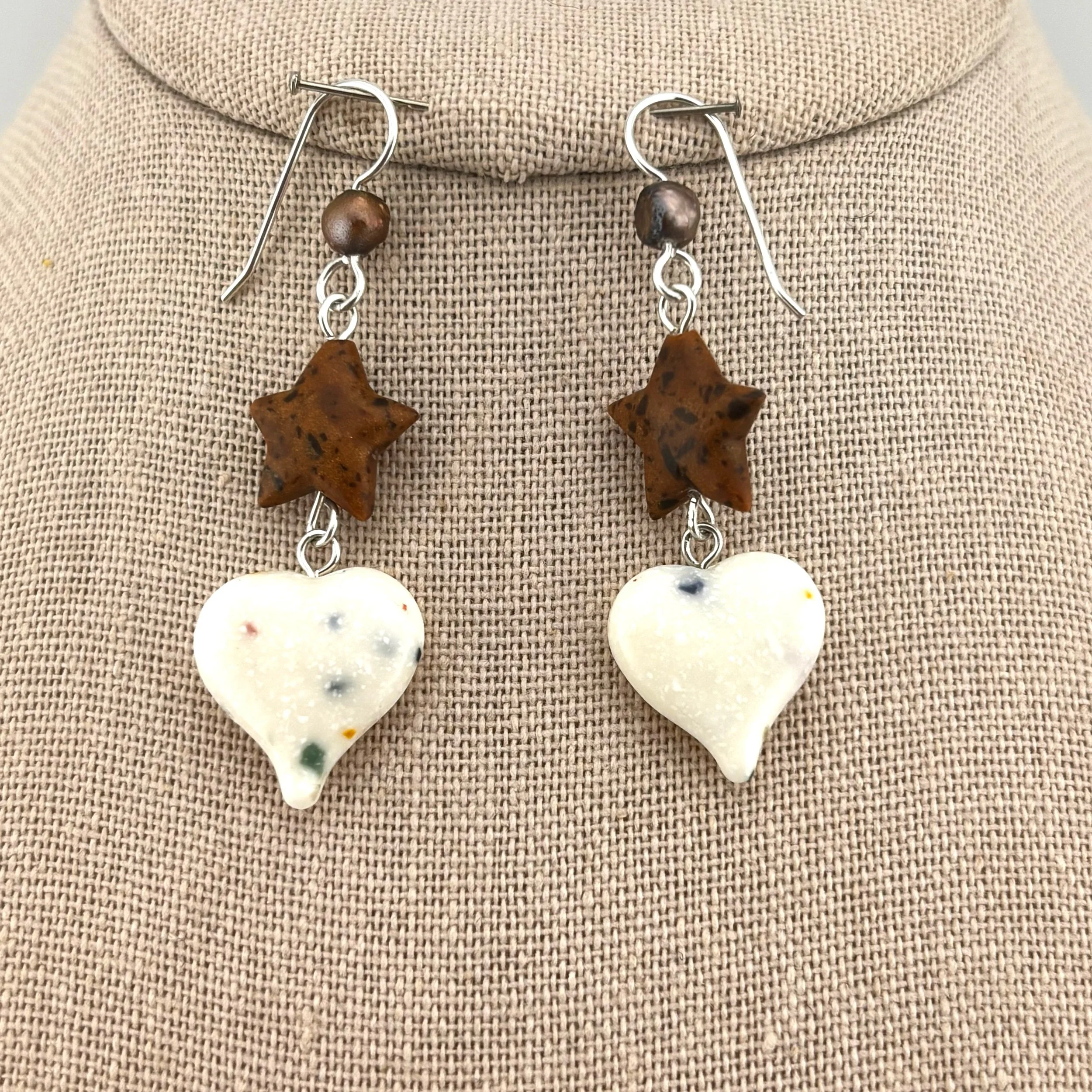 •Corian Heart/Star earrings hand carved by Christopher Miller. Sterling Silver findings and ear wires. Length: 2” below the earlobe.