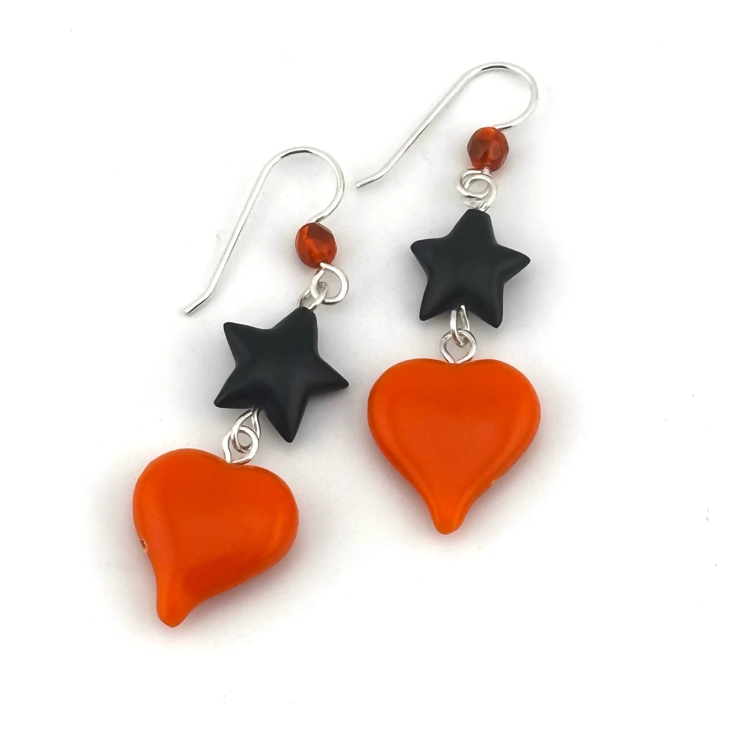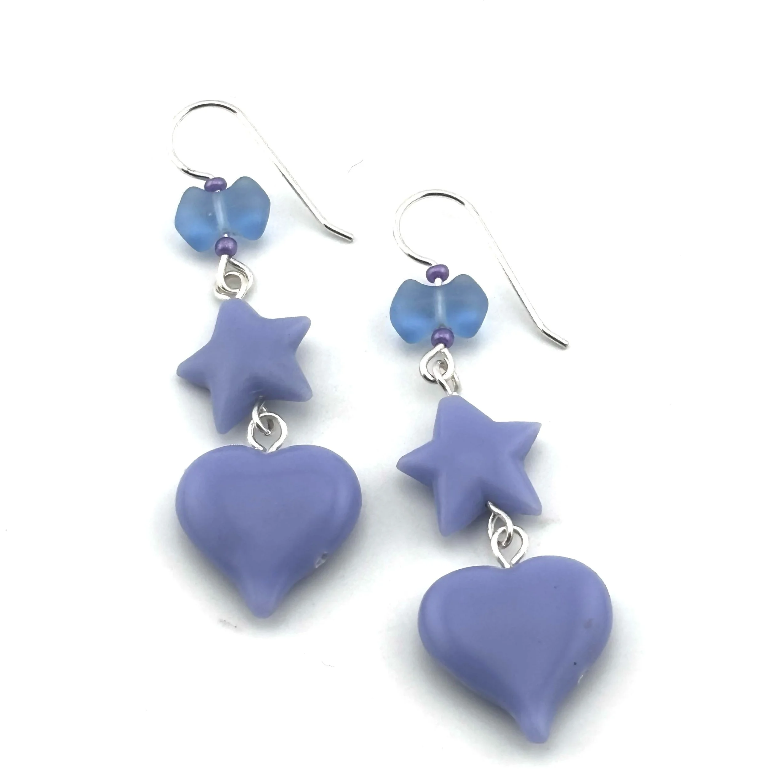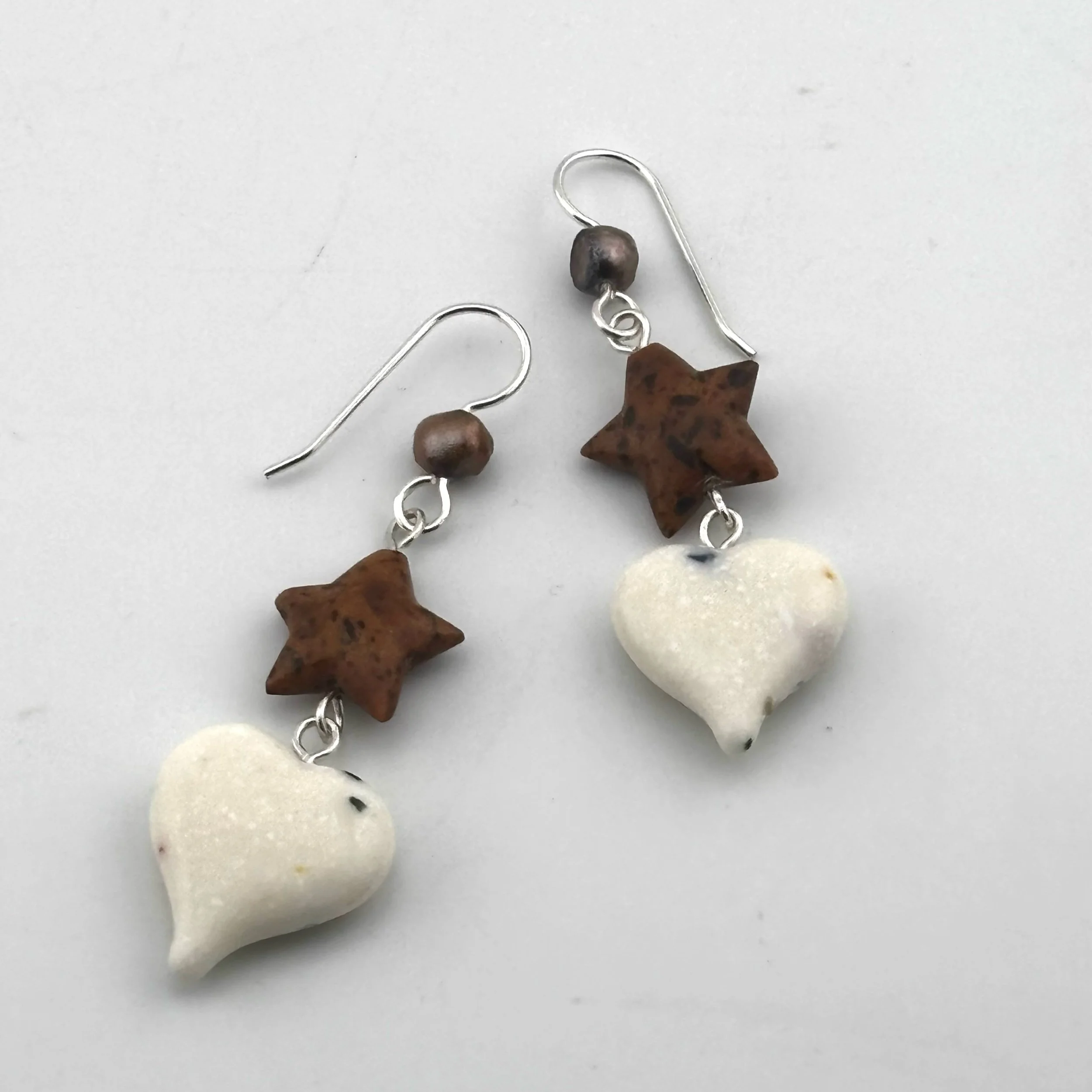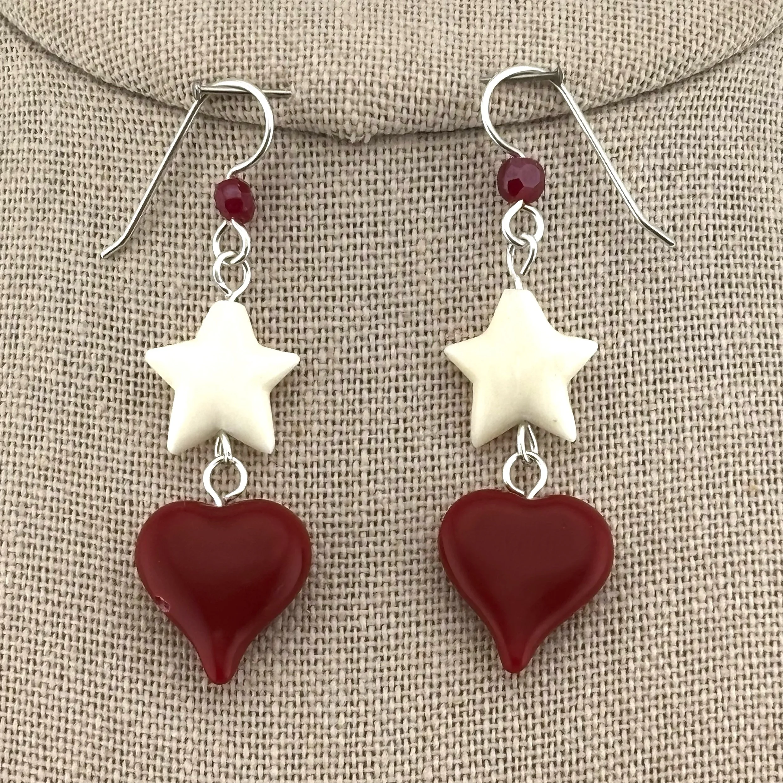 •Corian Heart/Star earrings hand carved by Christopher Miller. Sterling Silver findings and ear wires. Length: 2” below the earlobe.