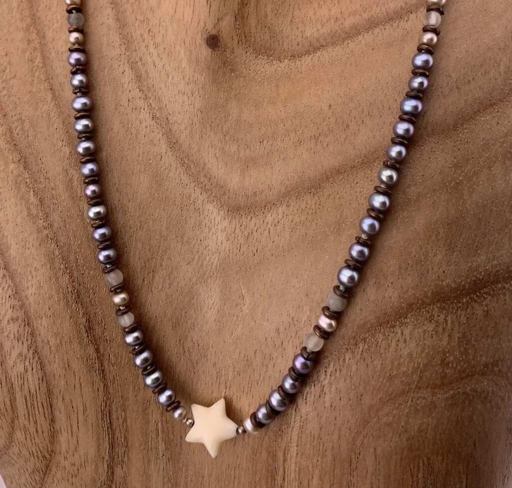 Hand knotted Beadwork by the late Judith Schiavone, with her beloved Pearl varieties on a bone star hand carved by Christopher Miller. Copper spacers, gray & honey pearls, rose quartz, gold filled clasp.