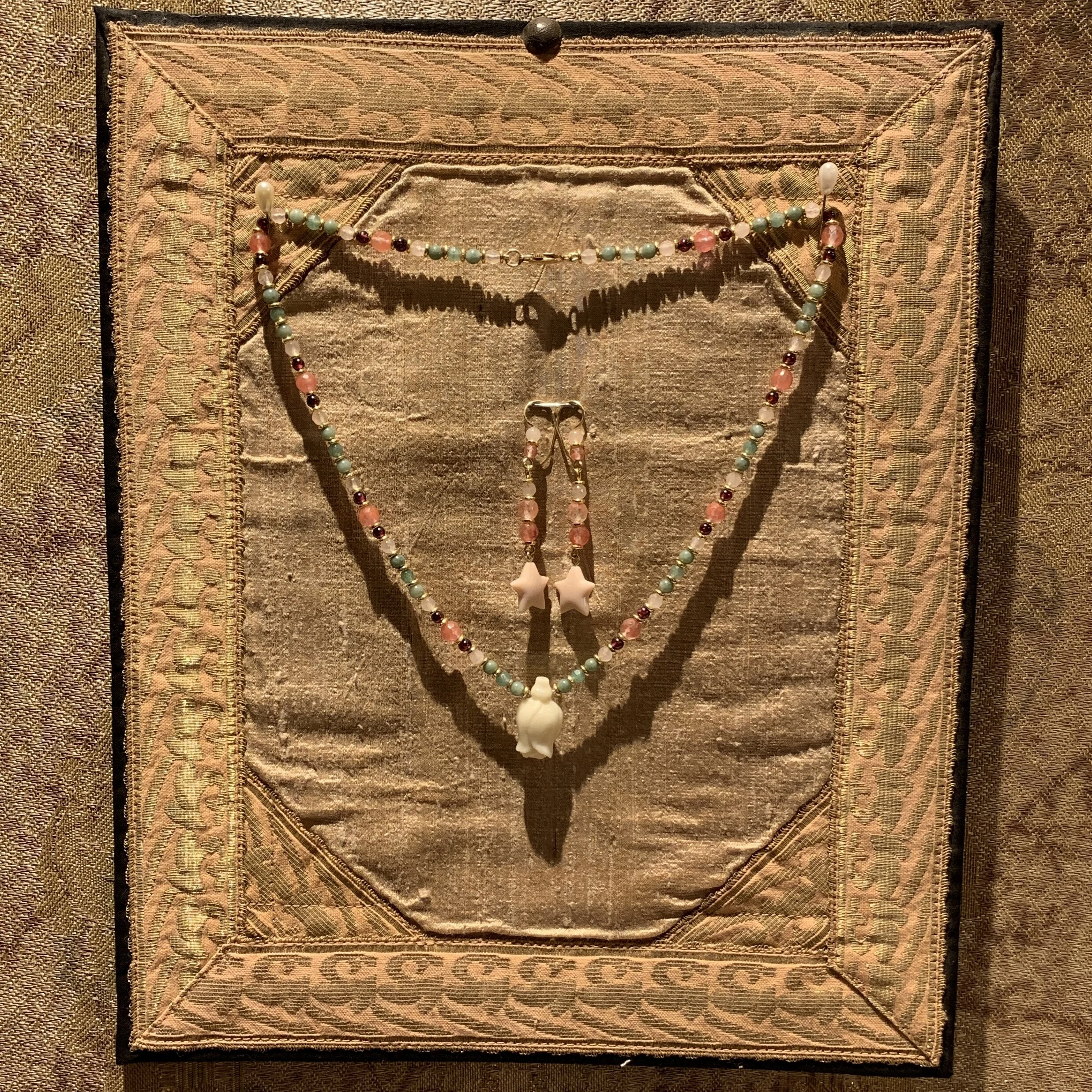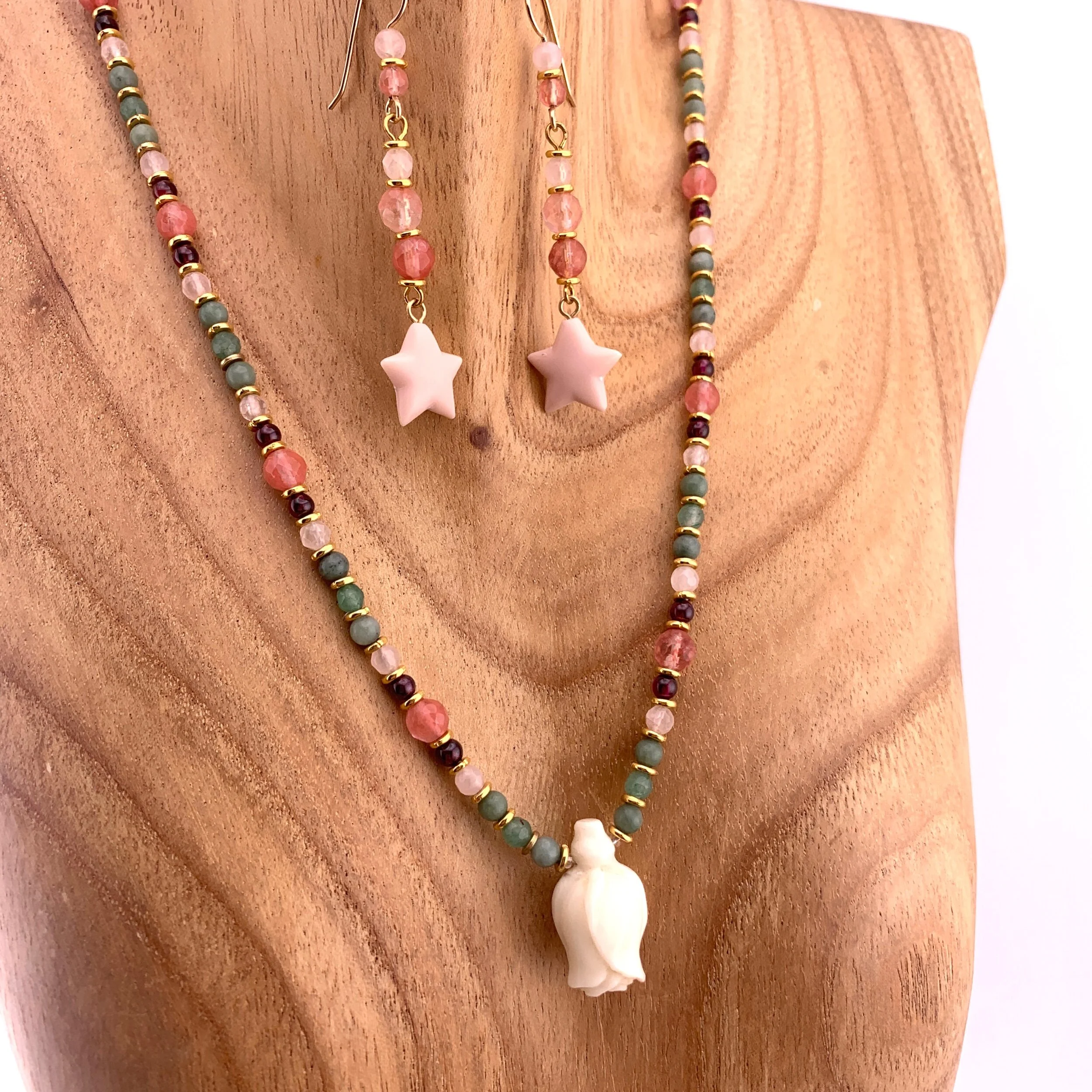Lavender jade, Aventurine, Faceted aventurine, Rose quartz, Garnet, Faceted rhodochrosite, Gold plated spacers, Squeeze clasp