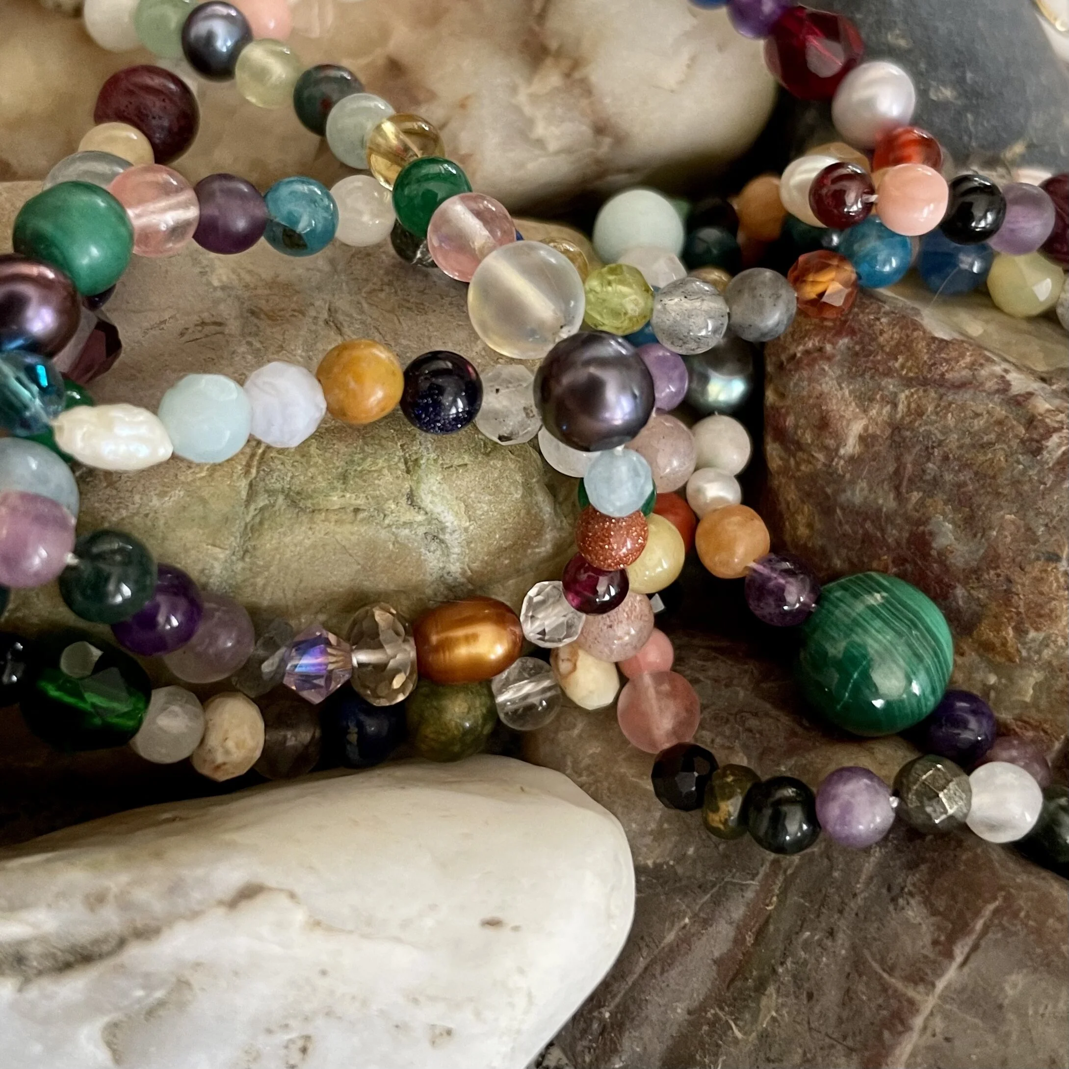 It may seem funny to some… Imagine me in my studio, attempting to make necklaces as fast as my little fingers can, but having muscle spasms in my fingers so very frequently I drop a bead and you can hear me shout (insert favorite expletive here). Anyone who does anything with beads drops beads. I know there is no way I’m going to find that bead. So I move on. Eventually I get to a point where I deep clean my studio, including the floor. I collect all my floor beads and keep them in a basket. Now I have a basket of beads that don’t naturally go together. They sit. And sit. And sit some more. Ever growing. But then I realized that these beads all had something that brought them together, they all were the leftovers, the dropped, the forgotten, the ones cast off for their imperfections. I was inspired to make these necklaces from my basket of beads. They are organic, whatever I pull out is what gets put on the necklace. There are semi precious, precious, pearls, and glass in the basket. They are perfectly imperfect. I hope you love them as much as I do.