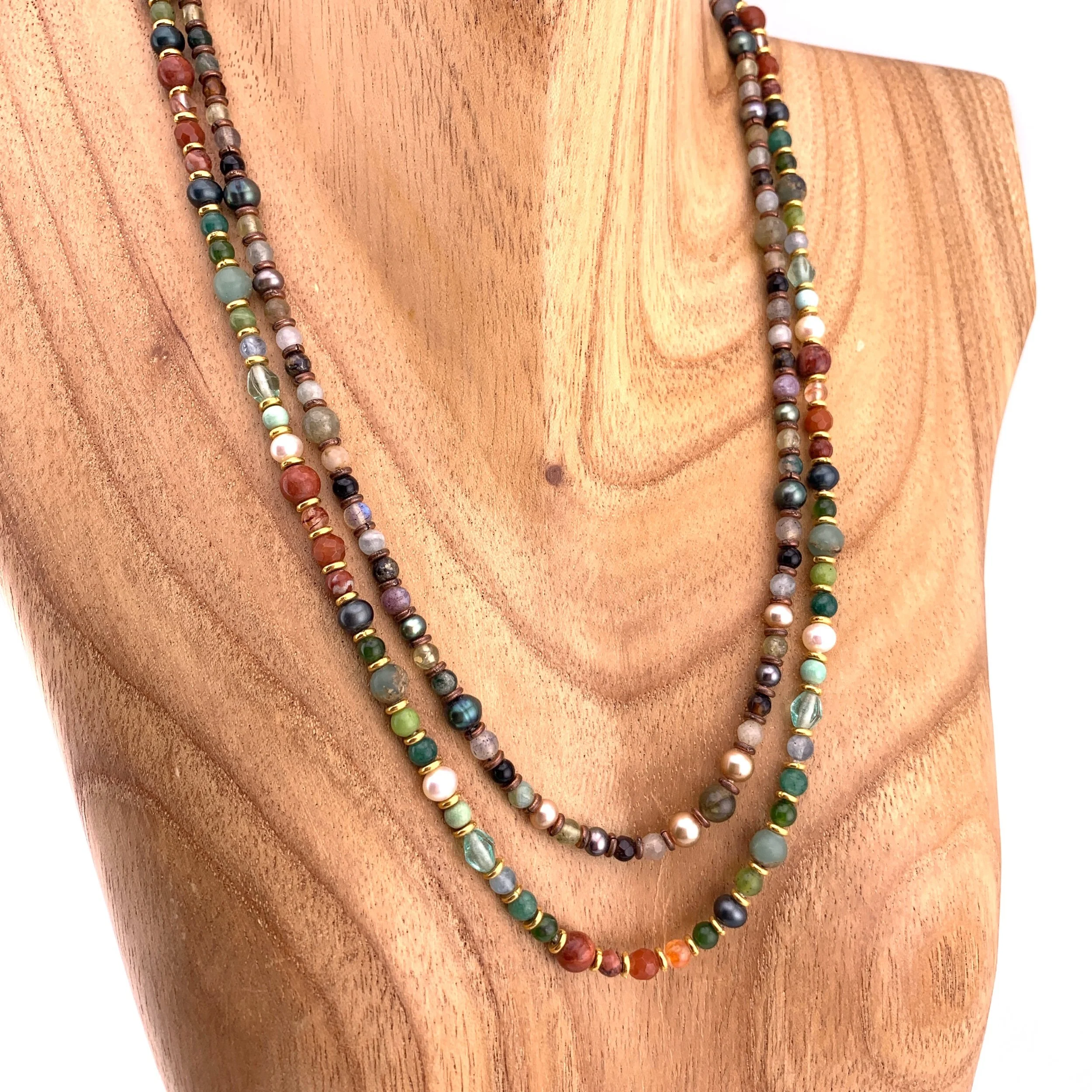 “Dancing wildly with pearls“, wrote Judith. Beadwork by the late Judith Schiavone with Chrysocolla, Jade, serpentine, aquamarine, rare lake turquoise, vintage cake-barrel glass, rutilated, quartz, apatite.