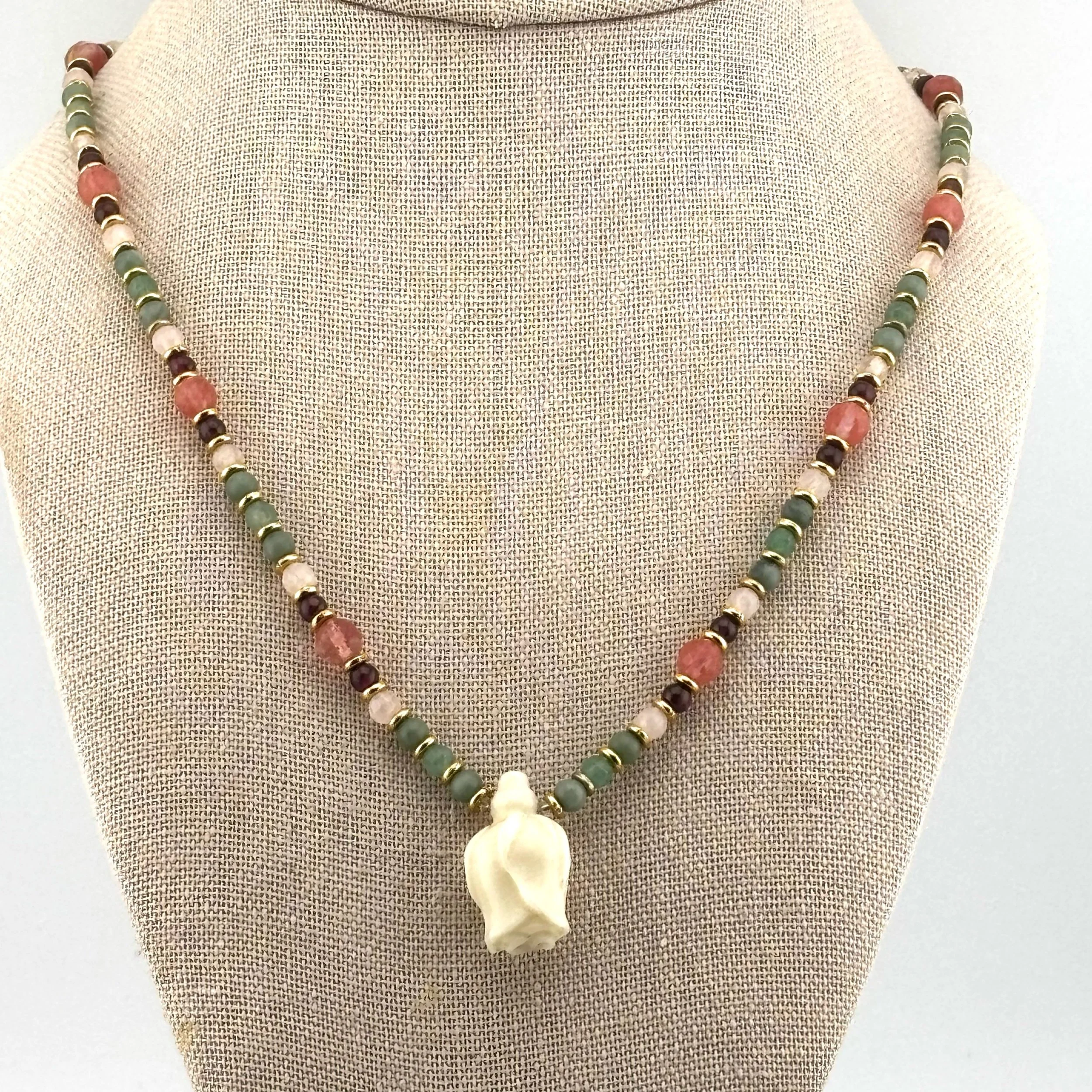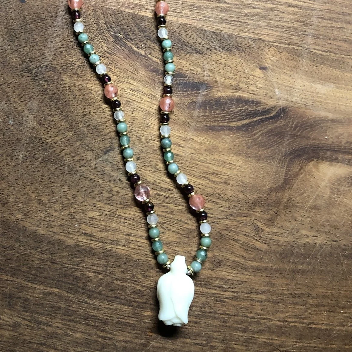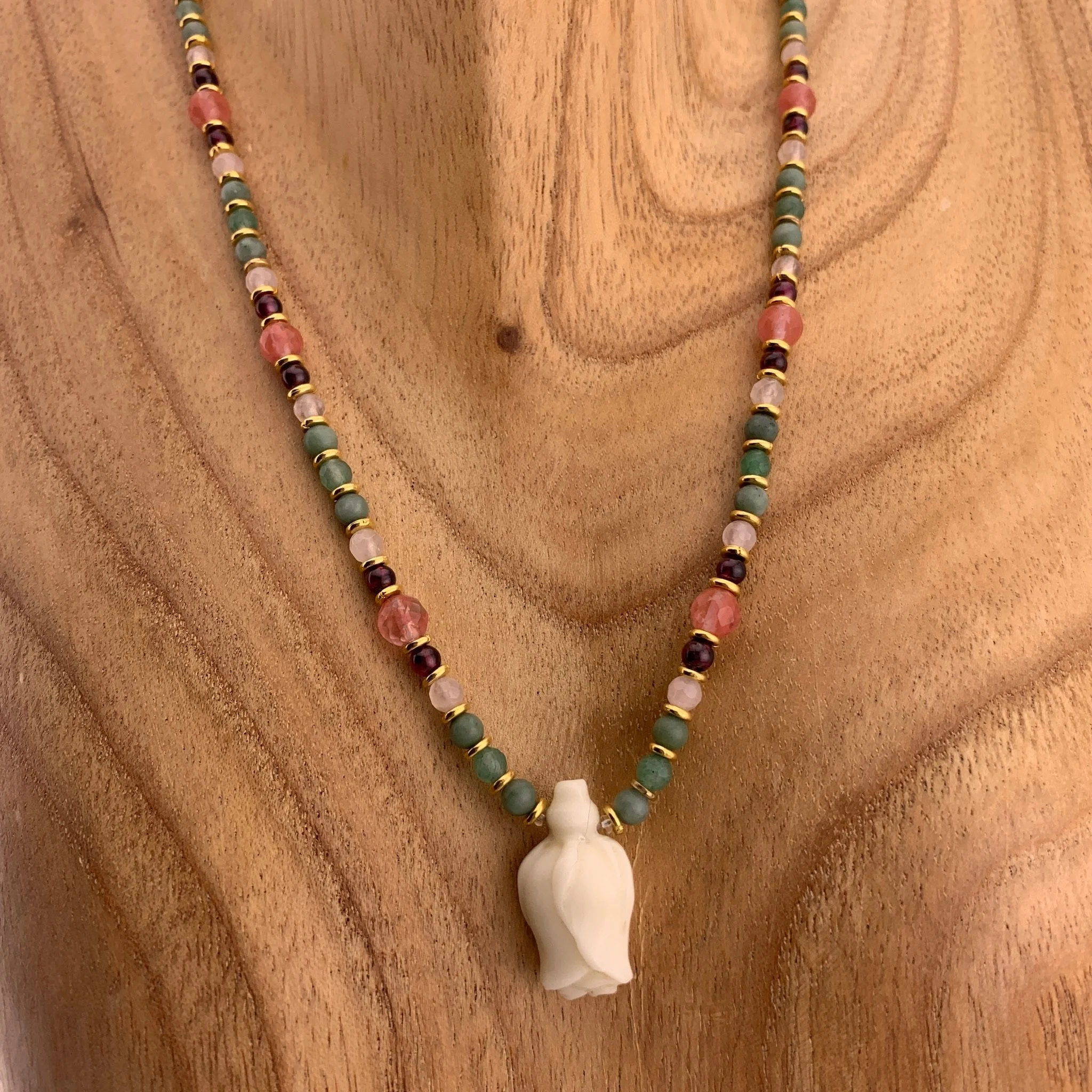 • Orchidea Rosa: Orchid Corian Rosebud hand carved by Christopher Miller, beadwork designed and handknotted on Silk by Marni Zimlin with Lavender jade, Faceted aventurine, Faceted rose quartz, Garnet & Rhodochrosite. 18” gold fill spacers & squeeze clasp.