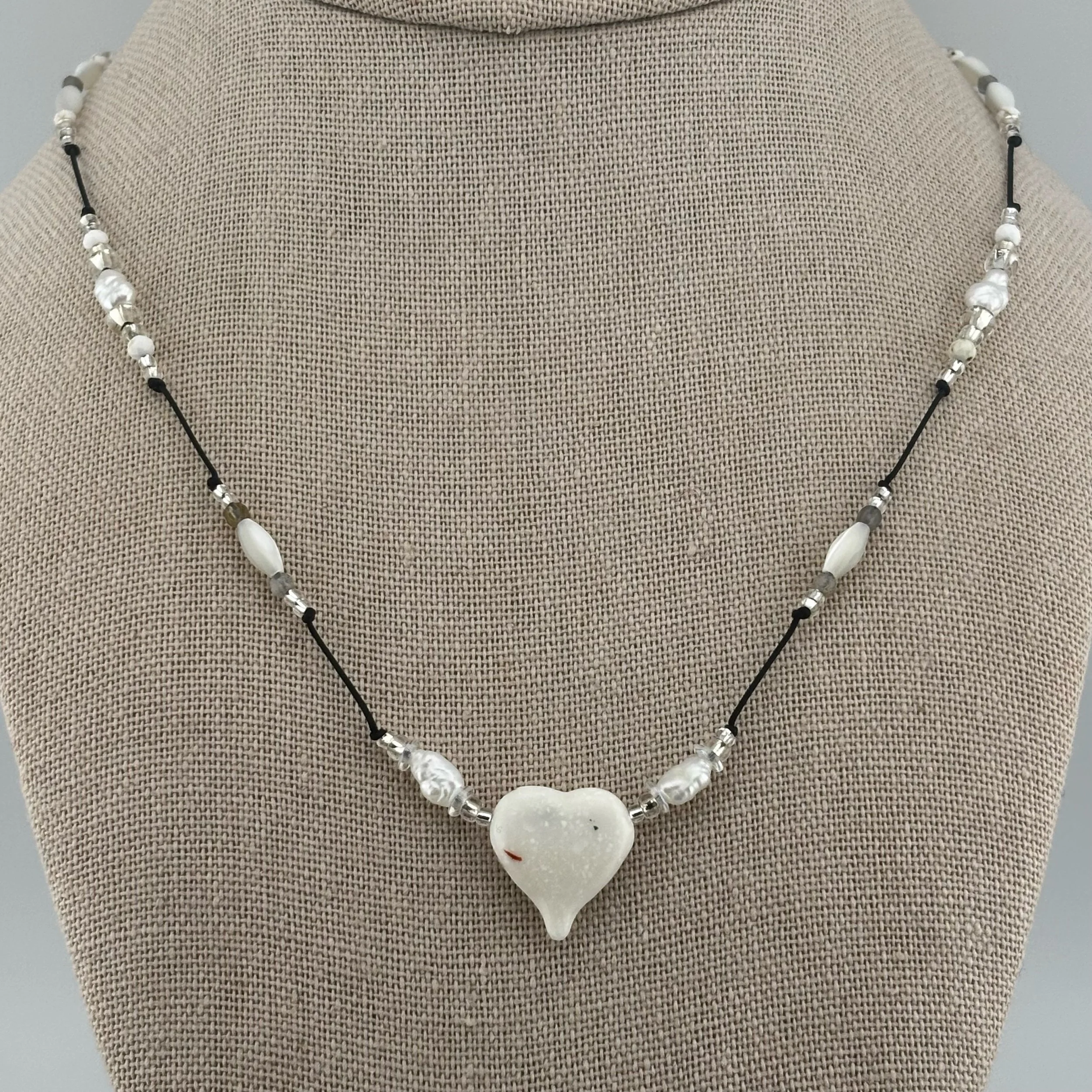 • Speckled White Heart: Corian heart hand carved by Christopher Miller, lightly beaded by Heidi B with Pearls, Mother of Pearl, Labradorite & Silver-lined seed beads on braided nylon cord with screw-type barrel clasp. 22” or shorter, please specify length in transaction notes. ✨✨✨🤍✨✨✨
