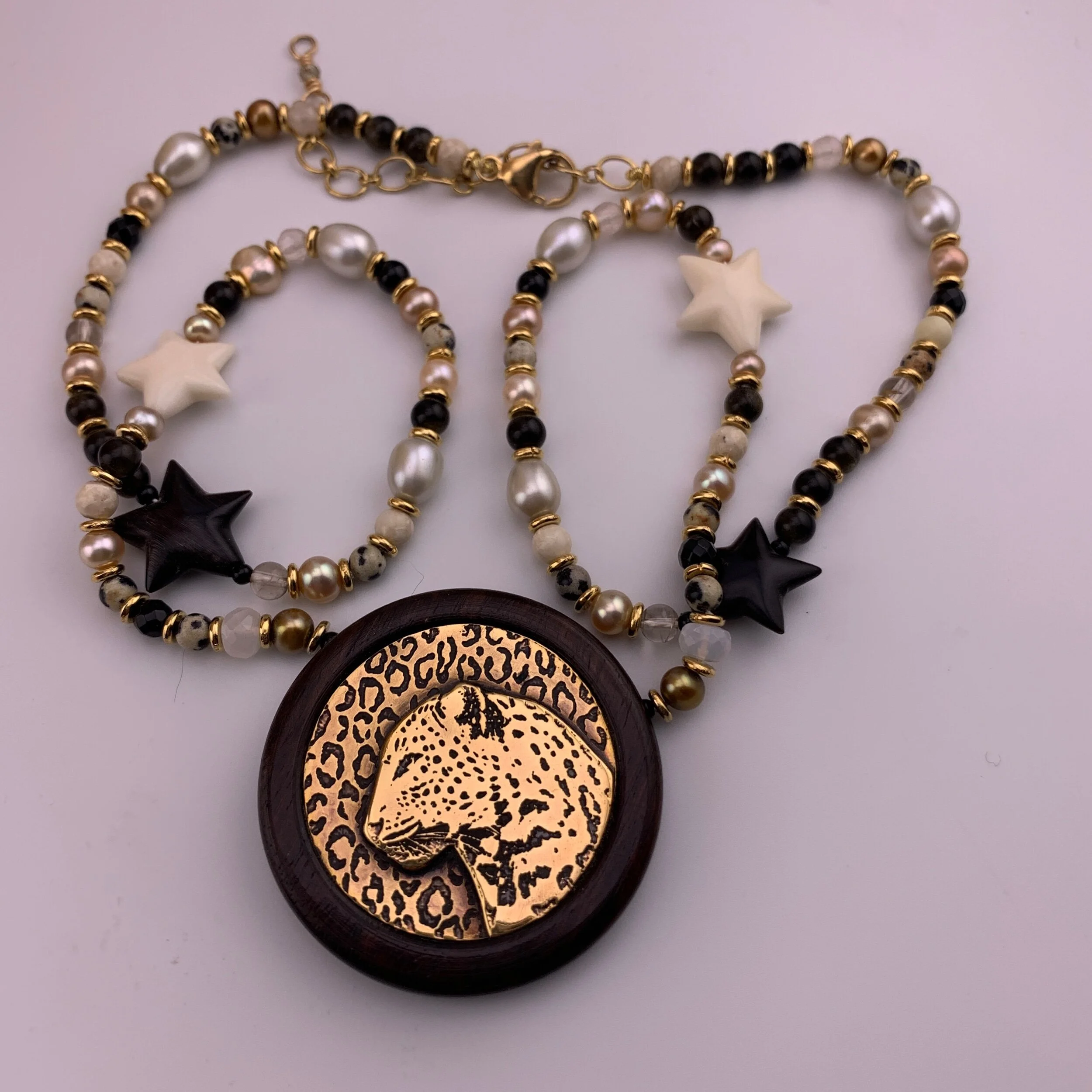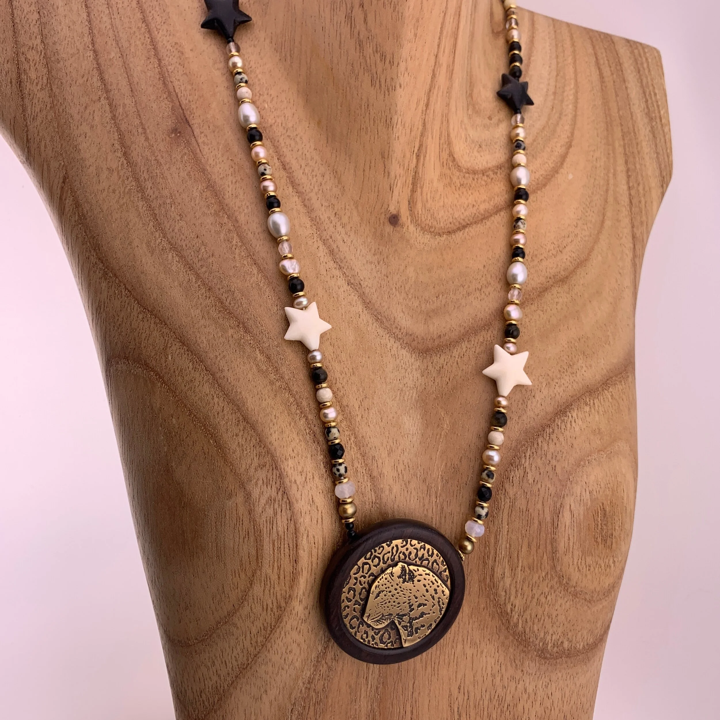 Pendant Layered in Coppered Brass on Ebony by Gino Schiavone. Hand carved bone and horn stars by Christopher Miller. Beadwork Designed and handknotted by Judith Schiavone.
