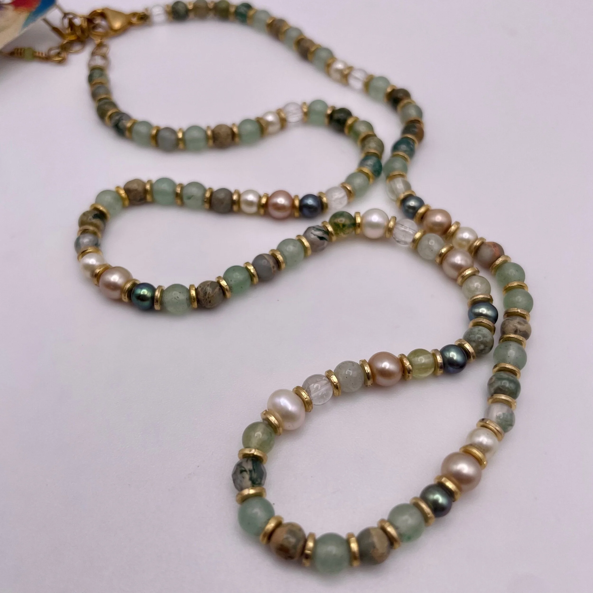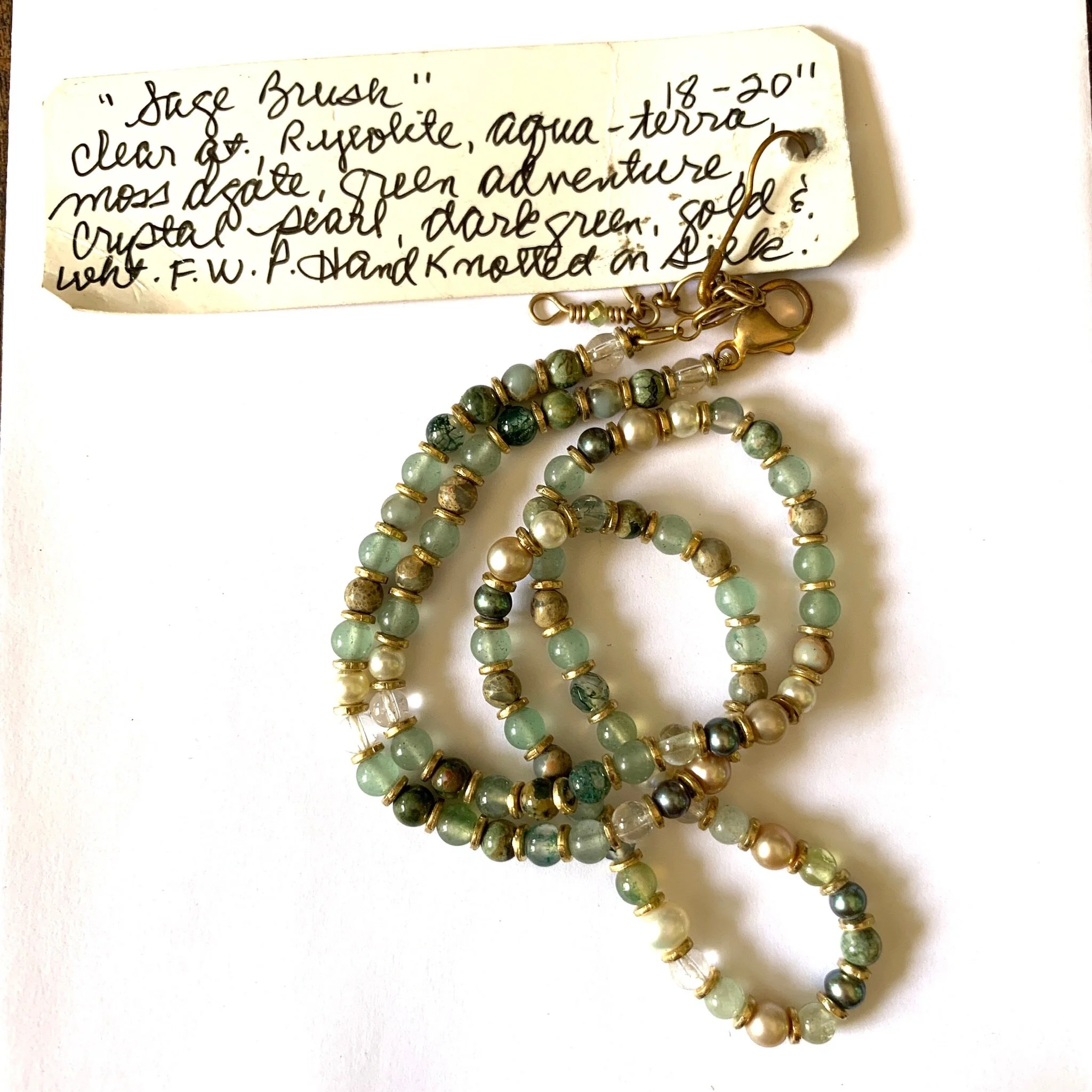 Hand knotted on silk by the late Judith Schiavone, with clear quartz, rhyolite, aqua terra, moss agate, green aventurine, crystal, pearl, dark green, gold and white freshwater pearls.
