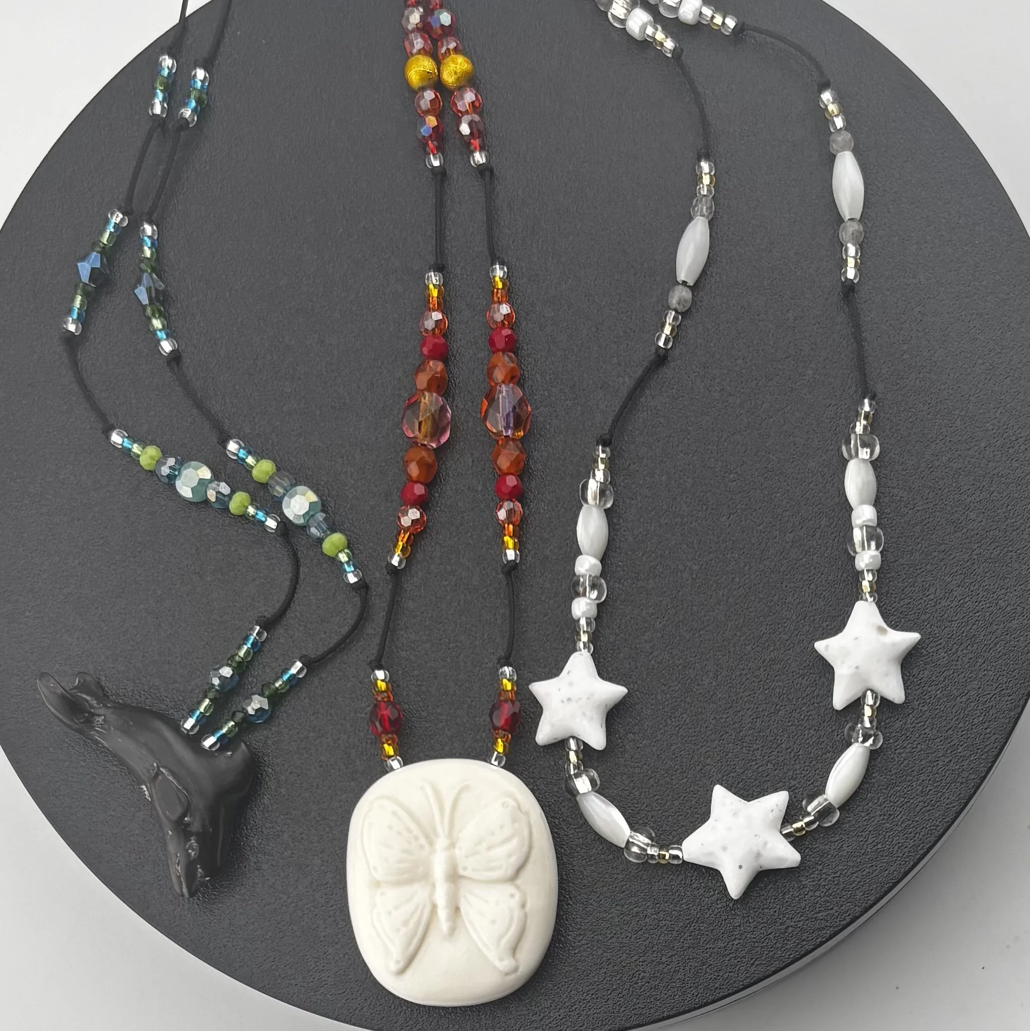 •Star Light, Star Bright: 3 white sparkling Corian Stars hand carved by Christopher Miller, lightly beaded by Heidi B with Mother of Pearl, faceted & molded glass, & Silver-lined seed beads on braided nylon cord with screw-type barrel clasp. 18” or shorter, please specify length in transaction notes.