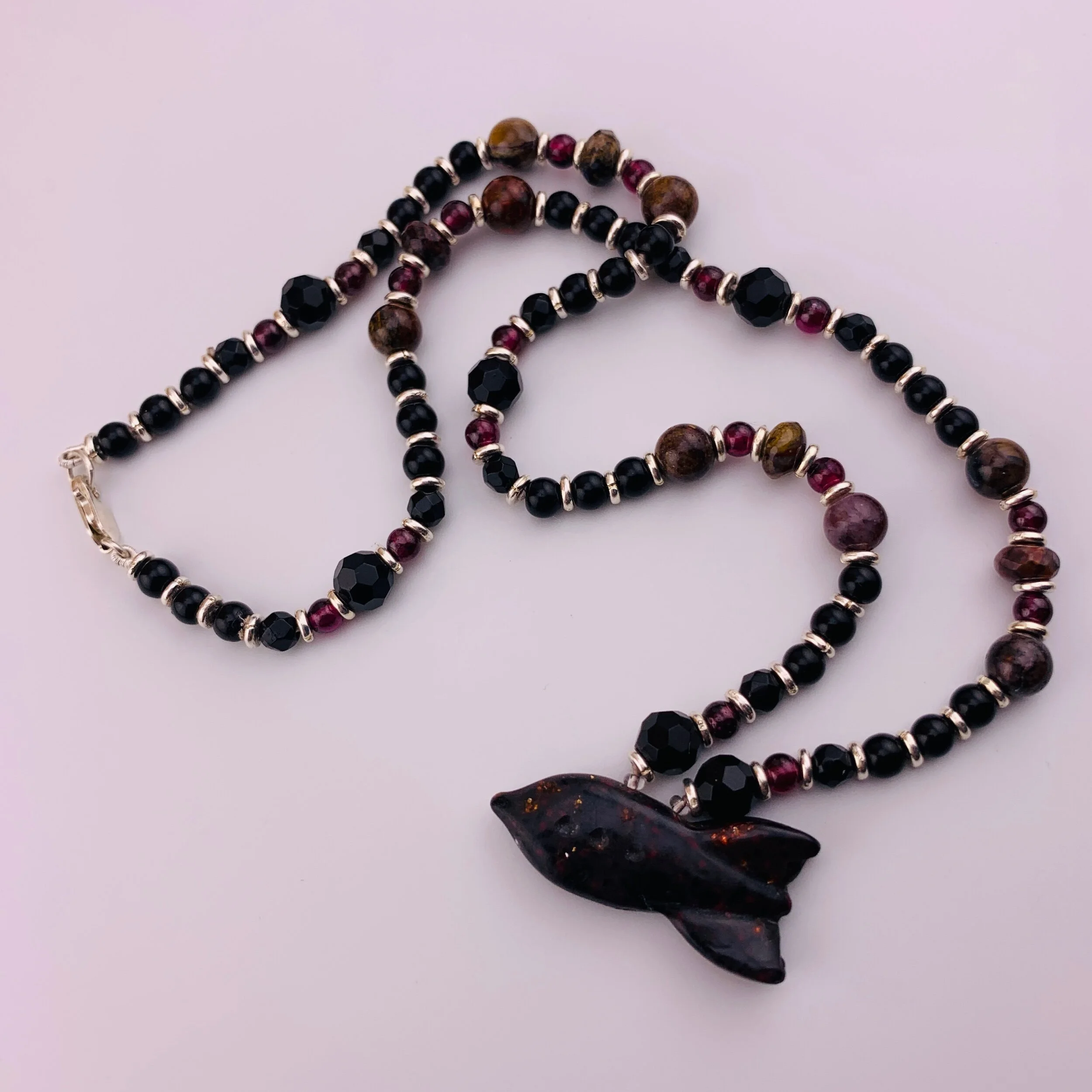 Hand carved Corian rocket by Christopher Miller. “Jupiter” Corian. Beadwork by Marni with Faceted jet, Garnet, Onyx, Jasper & Agate