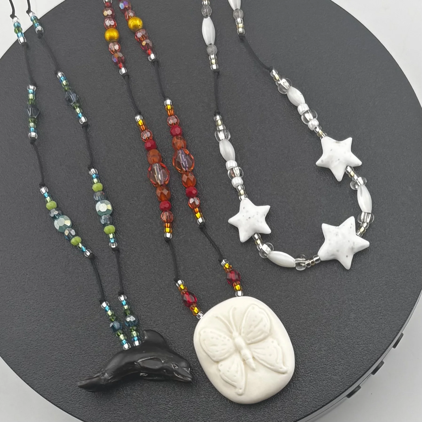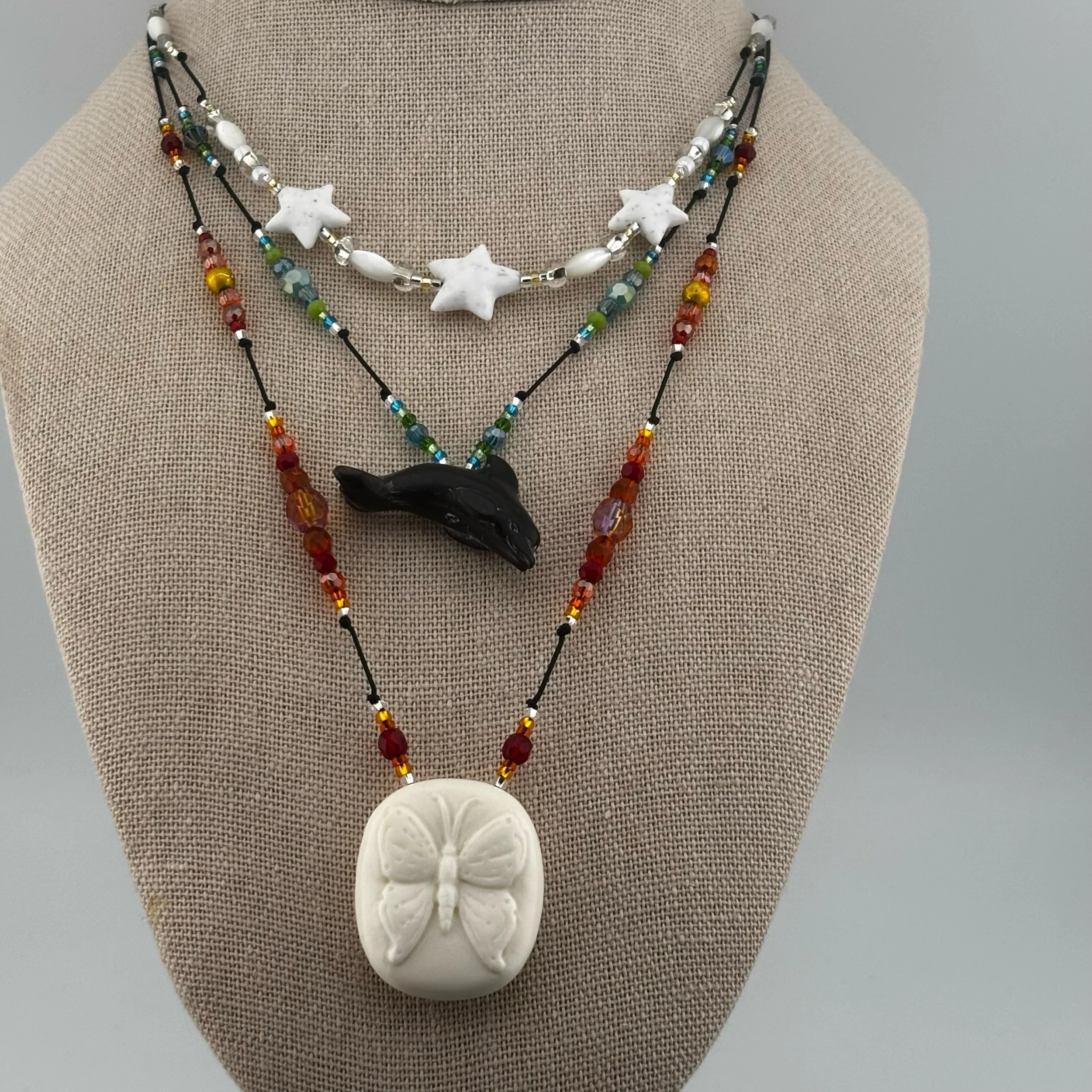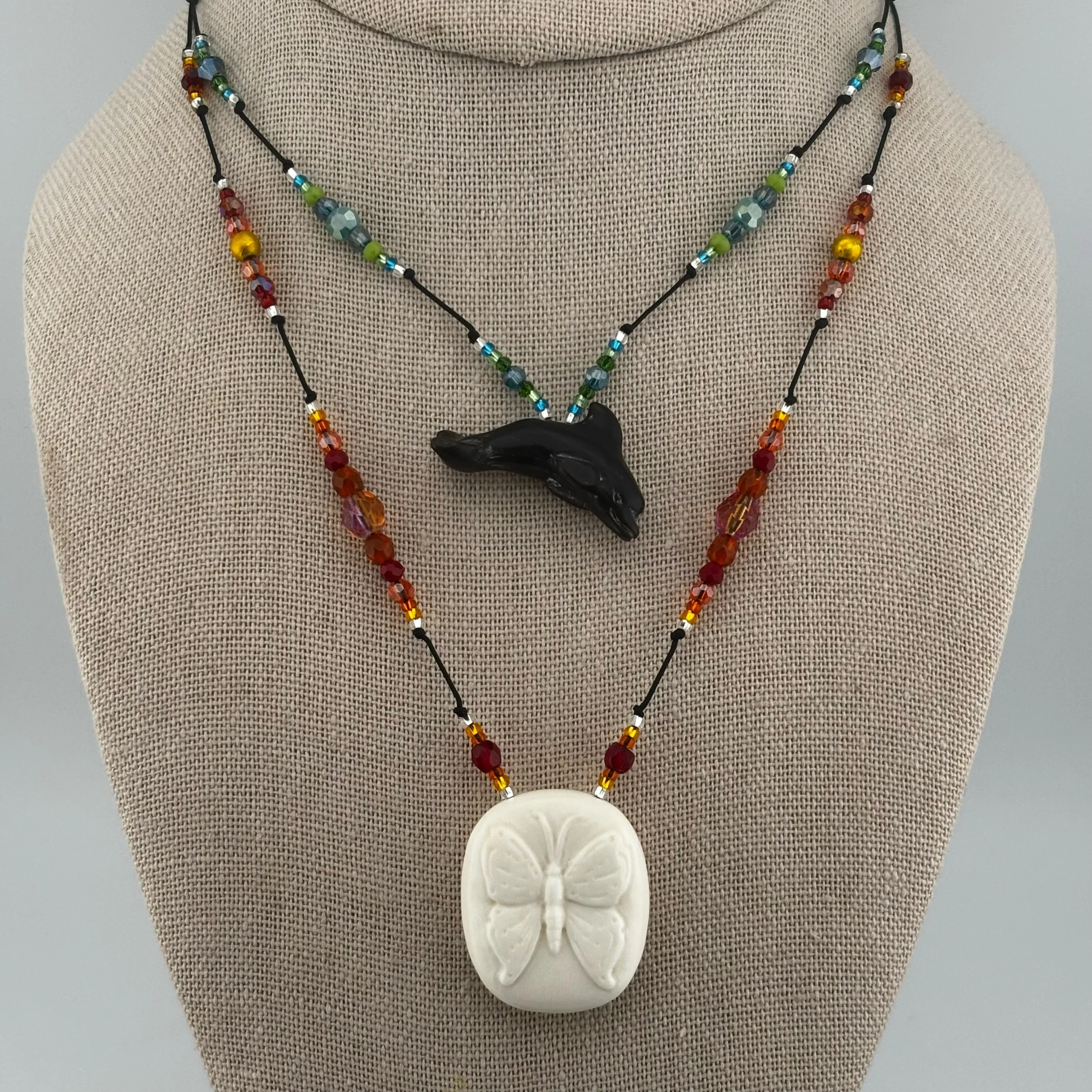 • La Reina Mariposa (Bone): Bone Butterfly hand carved by Christopher Miller, lightly beaded by Heidi B with faceted & molded glass, & Silver-lined seed beads on braided nylon cord with screw-type barrel clasp. 24” or shorter, please specify length in transaction notes.