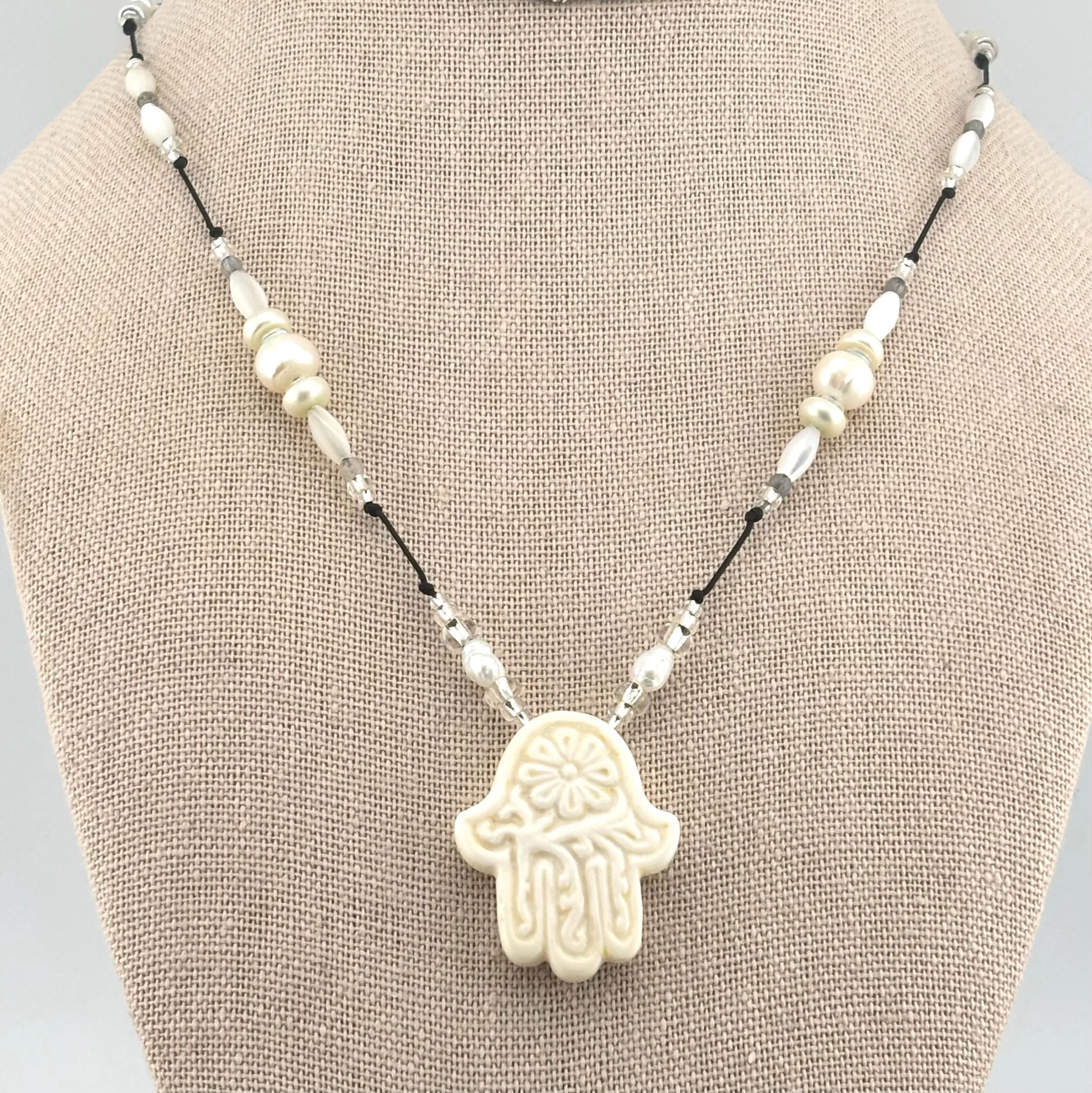 •Glimmering: Healing Hand of Light, Bone Hamsa hand carved by Christopher Miller, lightly beaded by Heidi B with Pearls, Mother of Pearl, faceted & molded glass, & Silver-lined seed beads on braided nylon cord with screw-type barrel clasp.