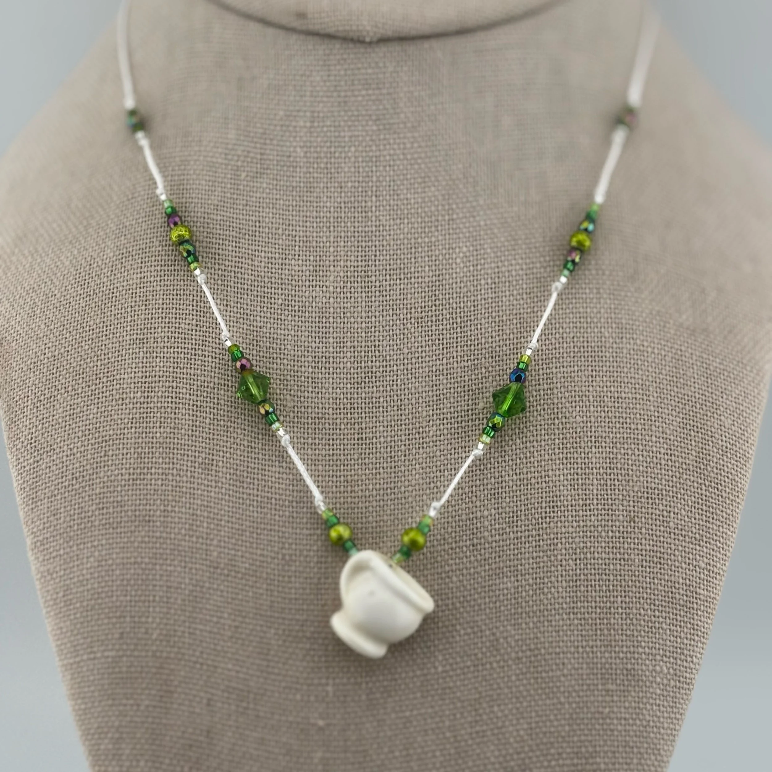 • Green Tea (bone): Bone Teacup hand carved by Christopher Miller, lightly beaded by Heidi B with Faceted, Molded, and Silver-lined Glass on braided nylon cord with screw-type barrel clasp. 18” or shorter, please specify length in transaction notes.