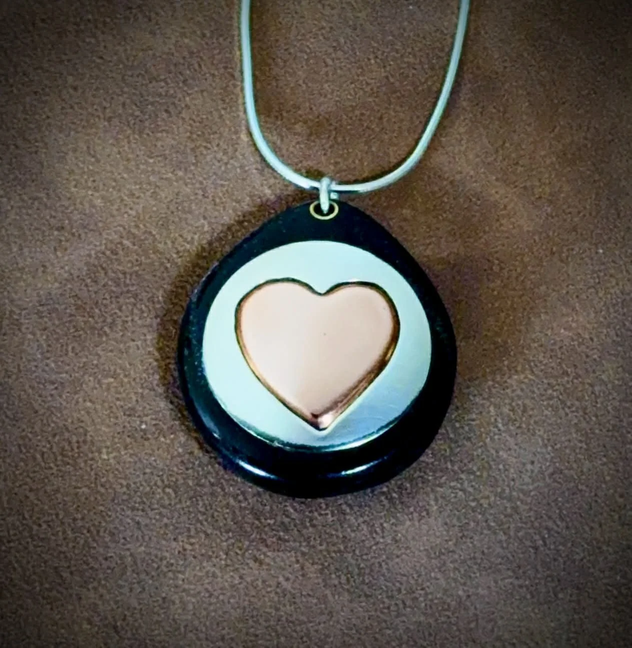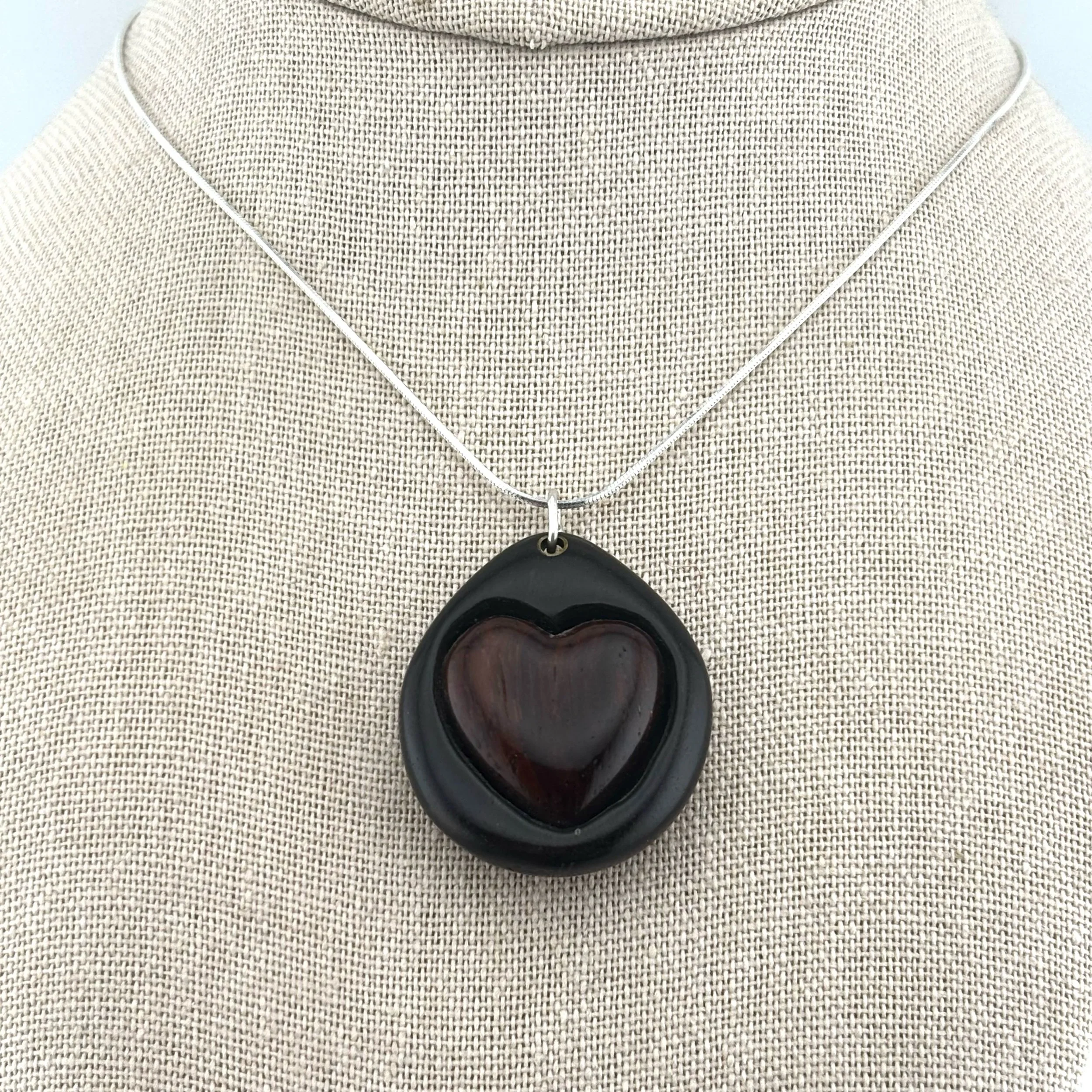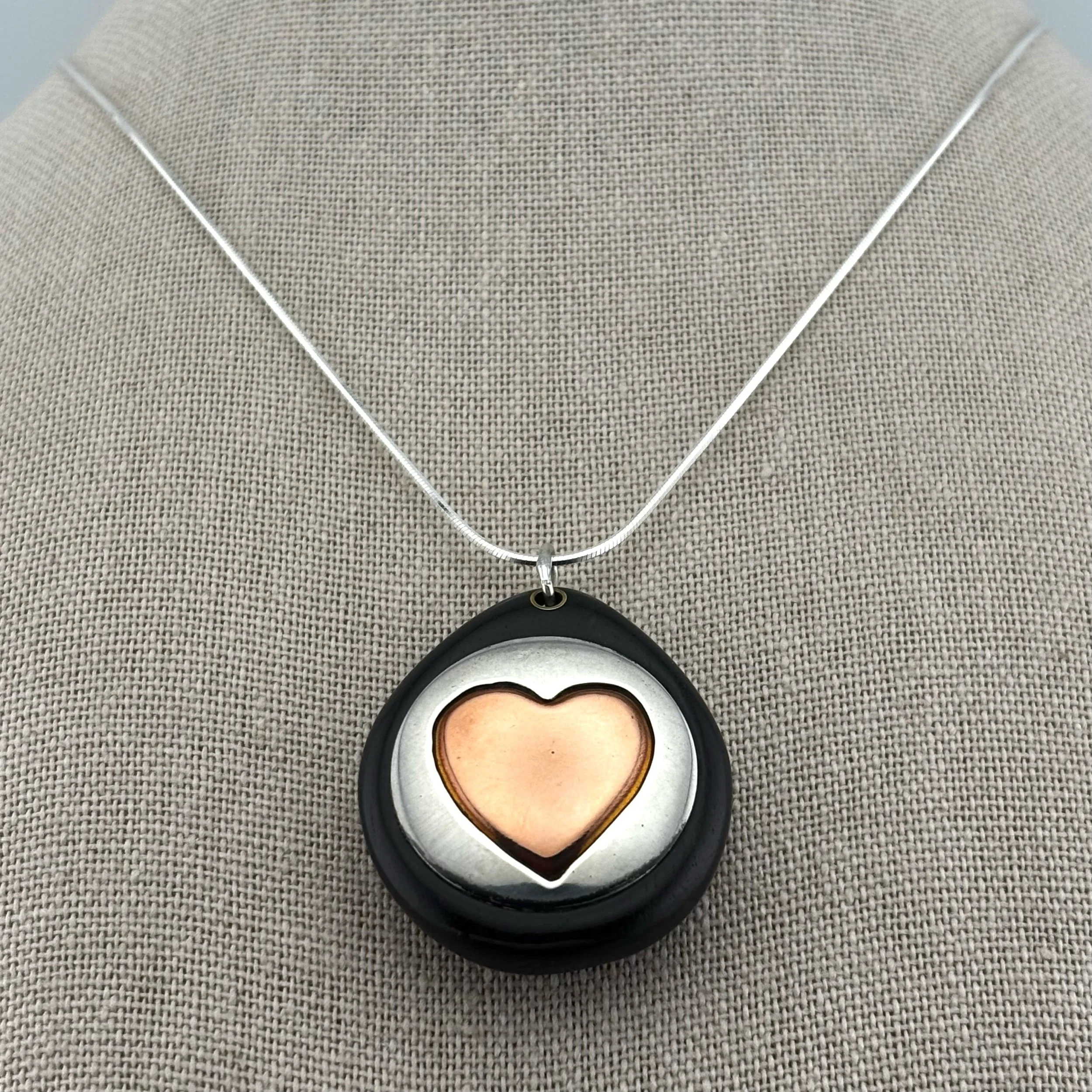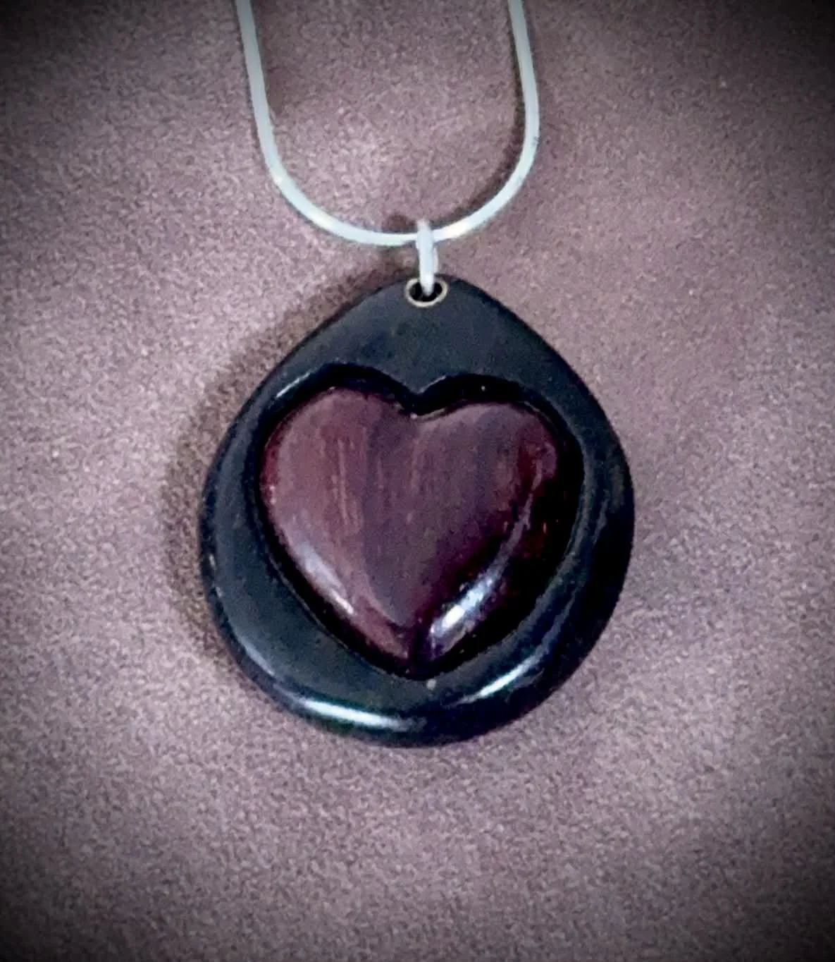 •Judith’s Heart by Gino. Double-sided wood & metal Pendant. Copper Heart set in Sterling Silver, set in Ebony. The reverse side is Purple Heart wood set in Ebony. 1.25” wide x 1.5” tall 1/4” thick. Overall Teardrop-shaped Ebony Pendant, hole for chain is reinforced with a silver core for this specially smooth 18” Silver Snake chain. A Unique and extremely sentimental Heart Pendant, created years ago by Gino as a gift for his late wife, Judith, his Muse and Soulmate for 36 years. (Judith Harriman Schiavone 1951-2021)