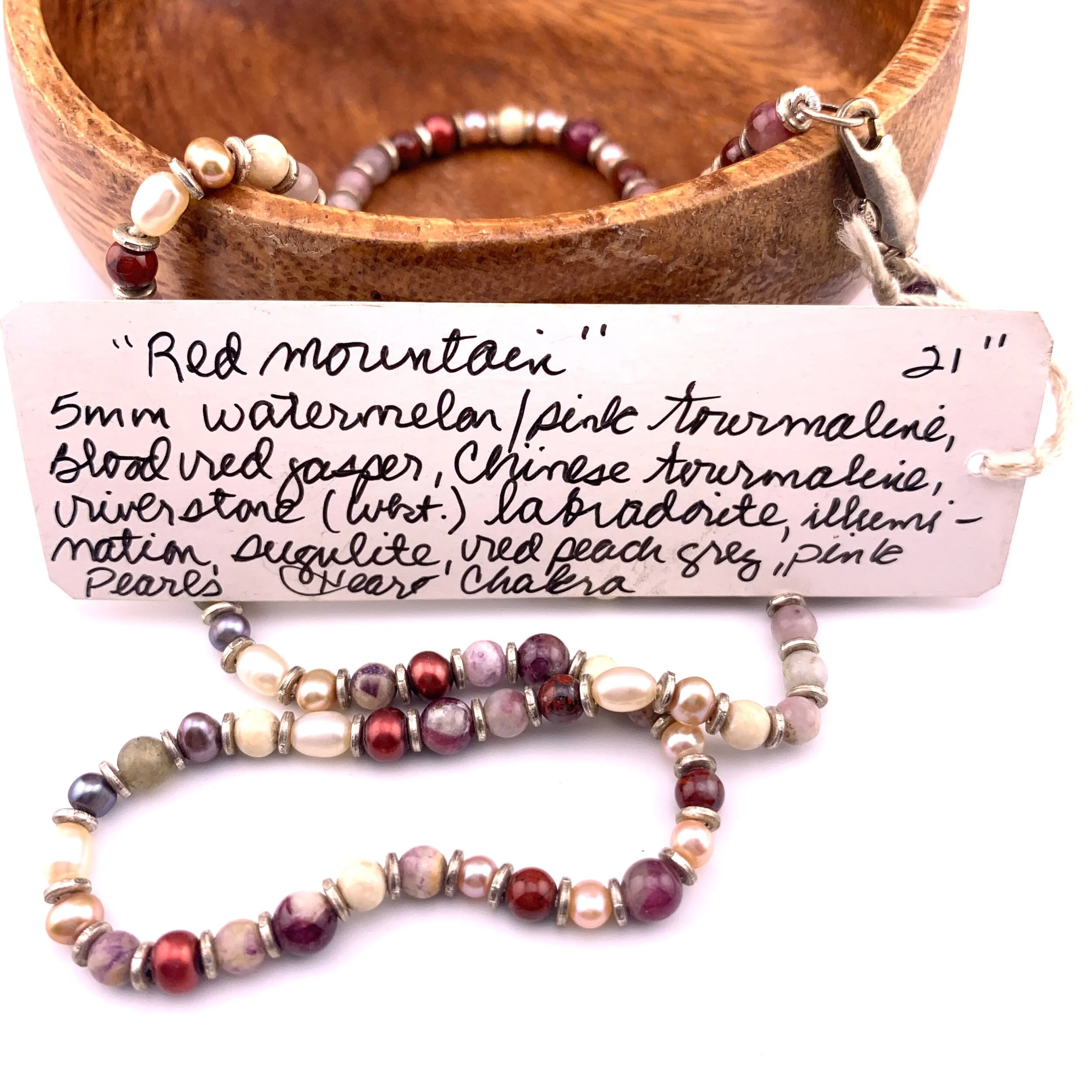 Card handwritten by Judith: “5mm watermelon/pink tourmaline, blood red jasper, Chinese tourmaline, Riverstone (white), Labradorite, illumination, sugilite, red, peach, gray, pink pearls. Heart chakra“.