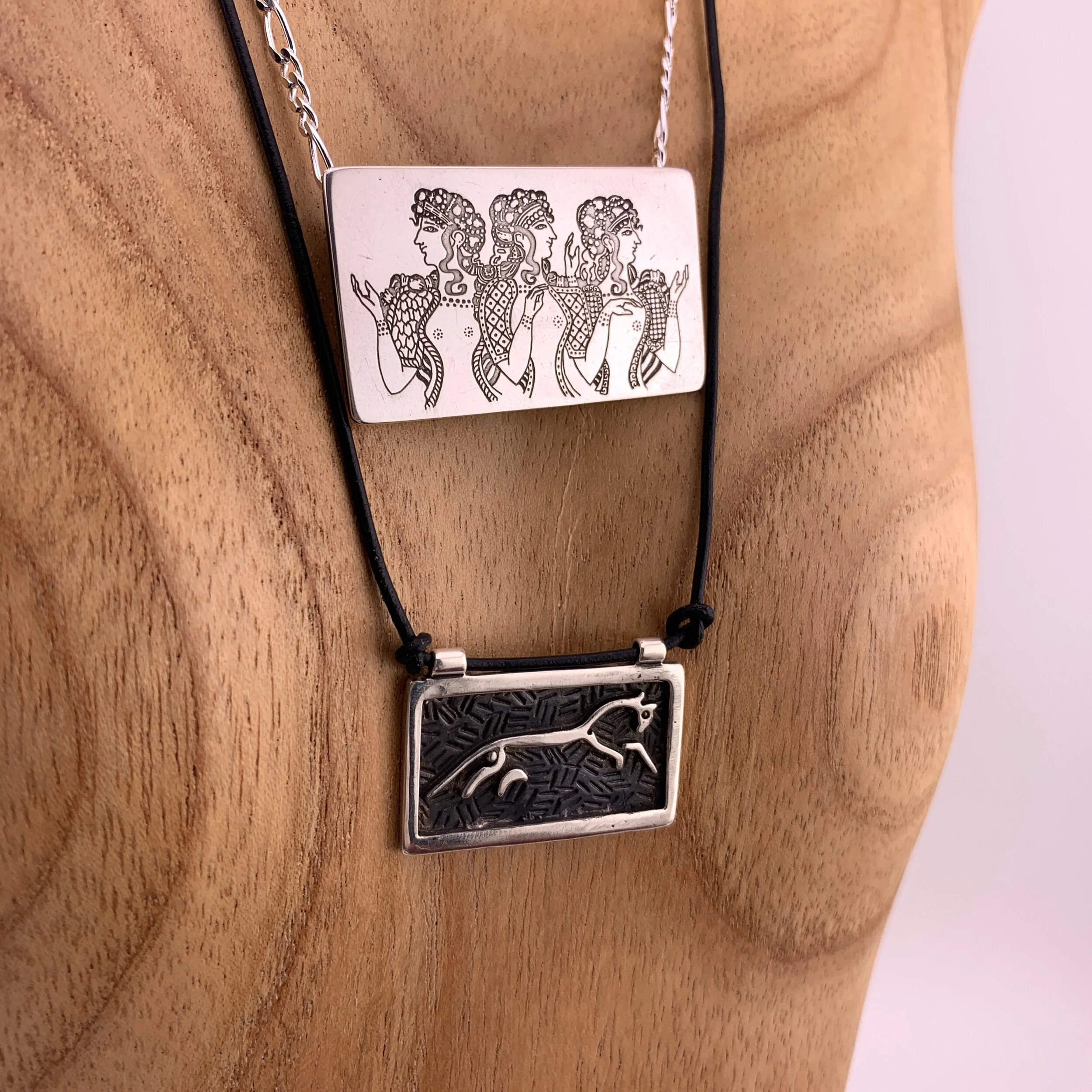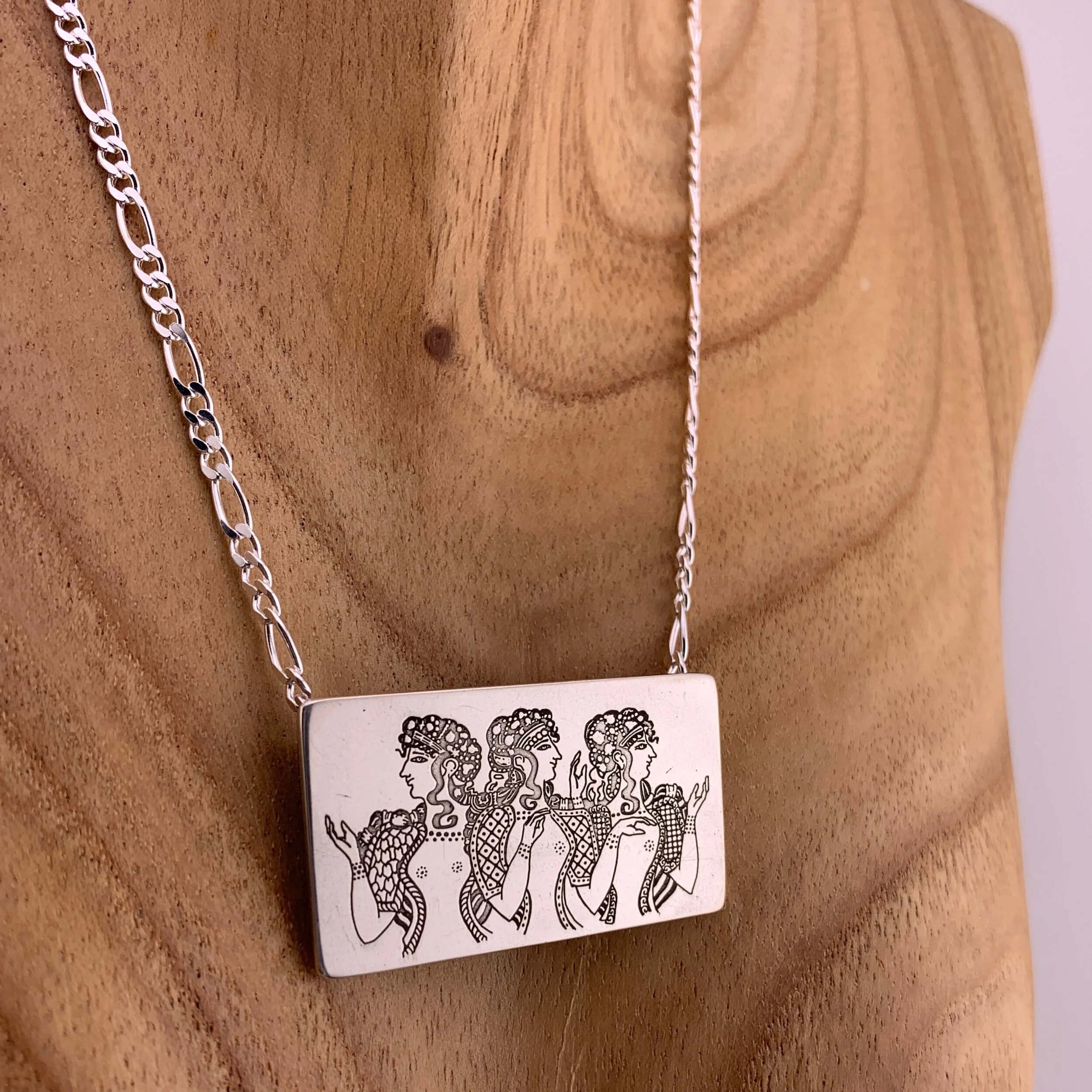 Etched in silver by Gino Schiavone, design inspired by the late Judith Schiavone, these three Minoan women are often referred to as “the three graces“, the three Demi goddesses, who determine a life span by spinning, measuring and cutting the cord of a lifetime.