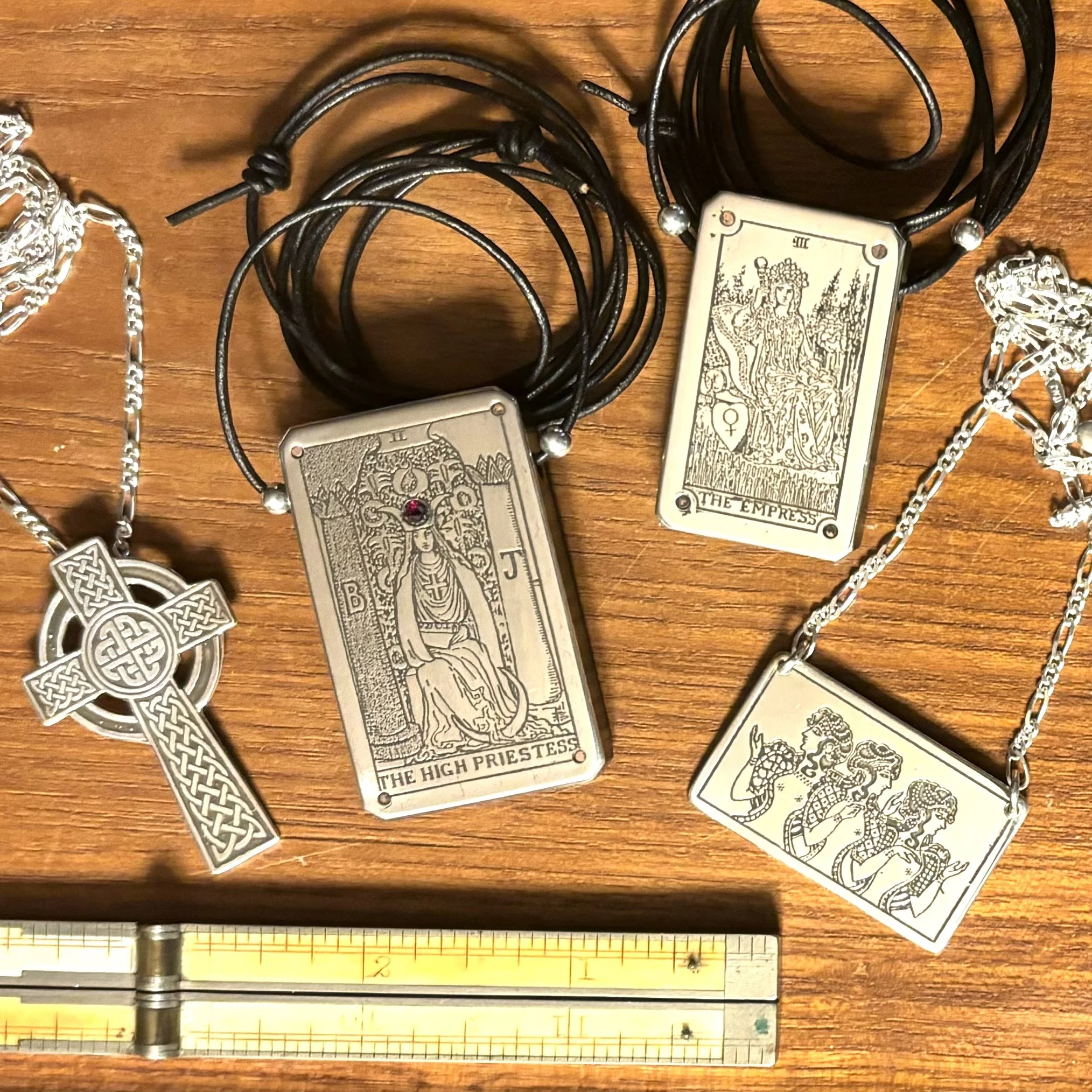 Celtic Cross Etched & delicately hand cut by Gino Schiavone in Sterling silver, suspended from a 18” figaro chain. Cross is 1-3/4” tall by 1 ⅛ “ wide. Shown in photo with standard size tarot pendant & ruler.